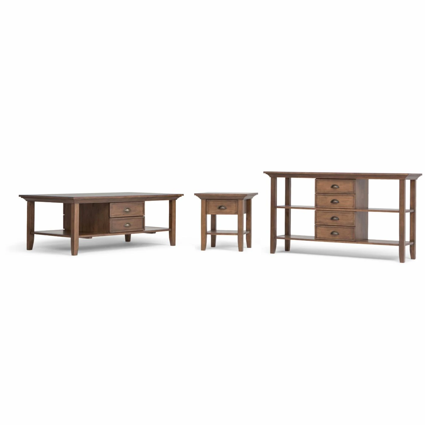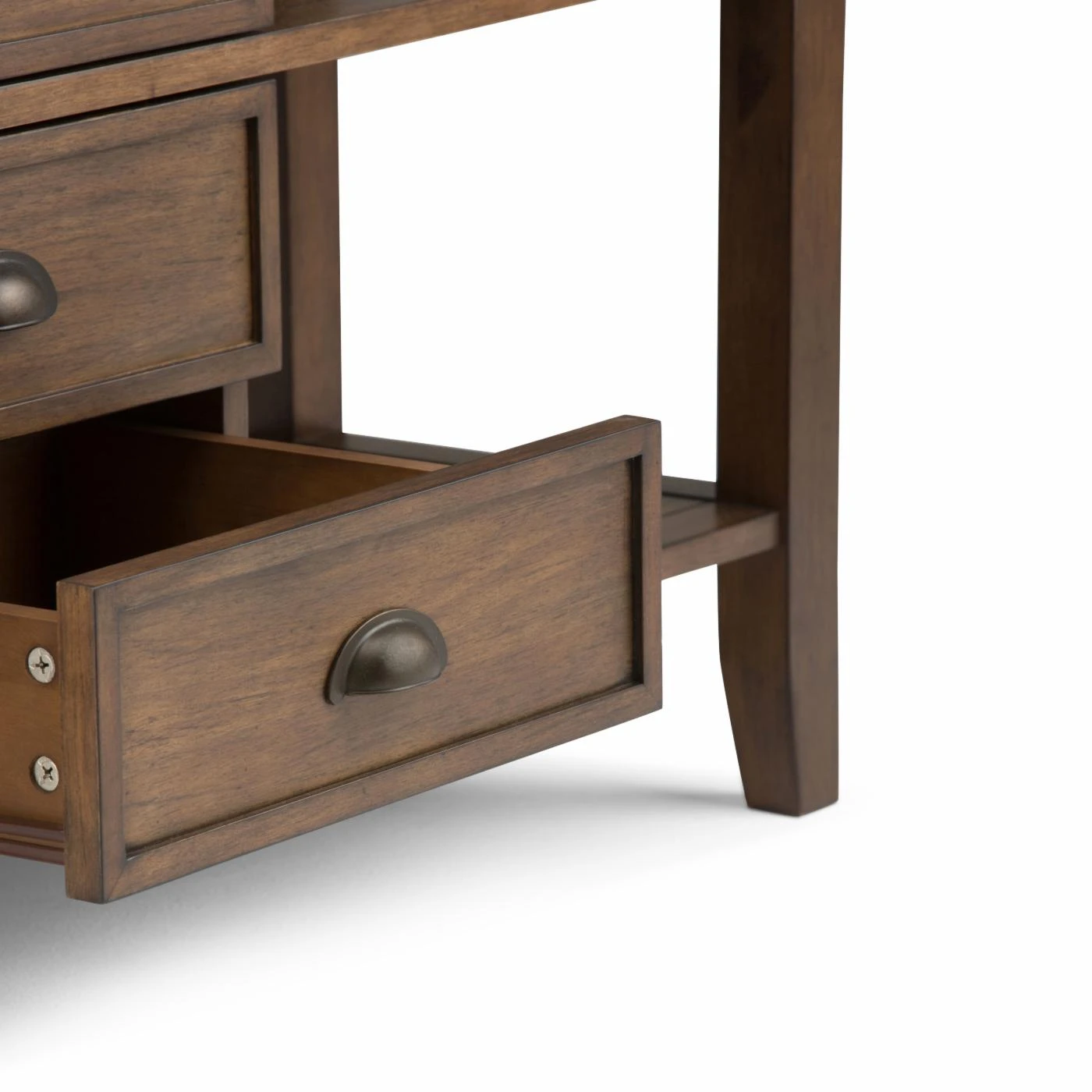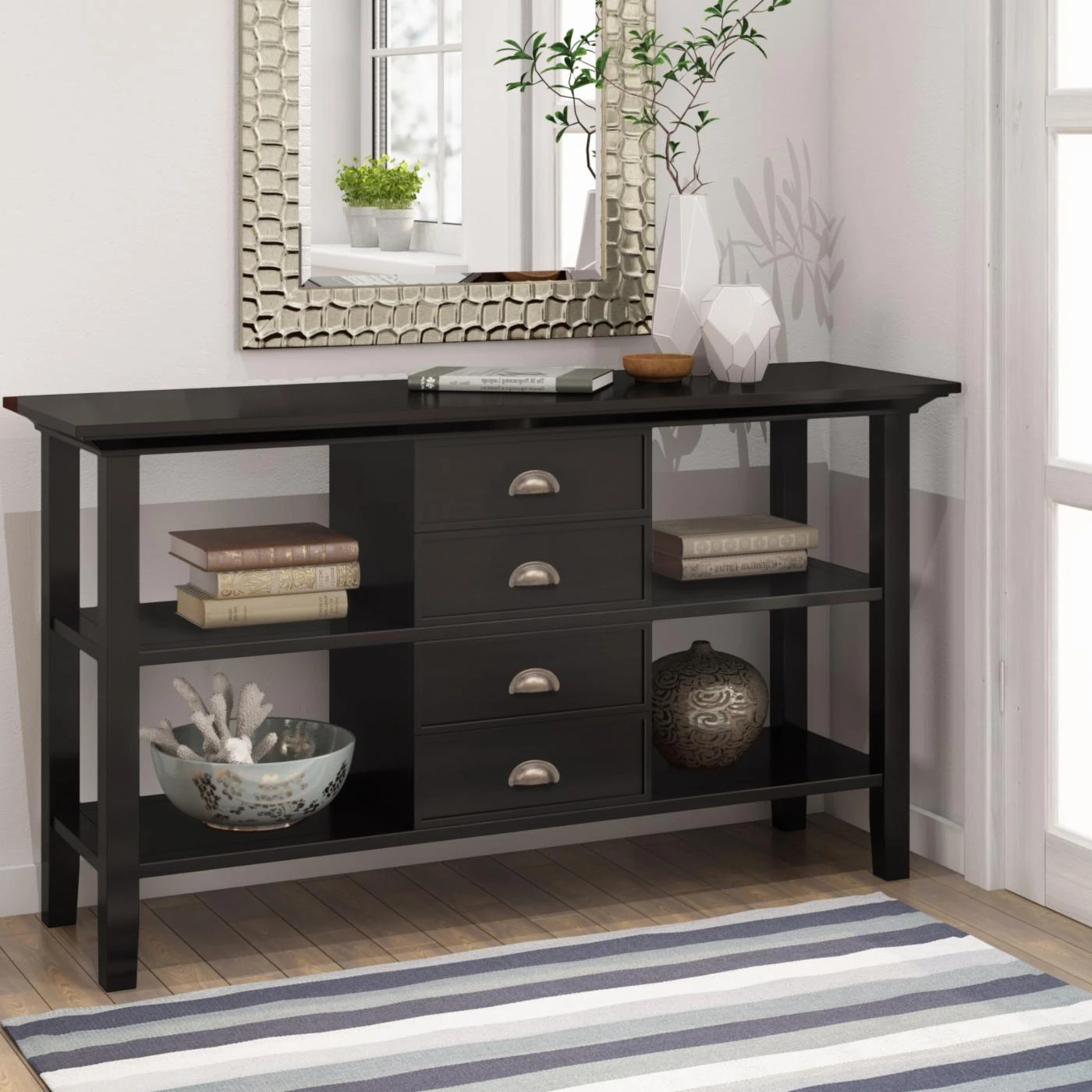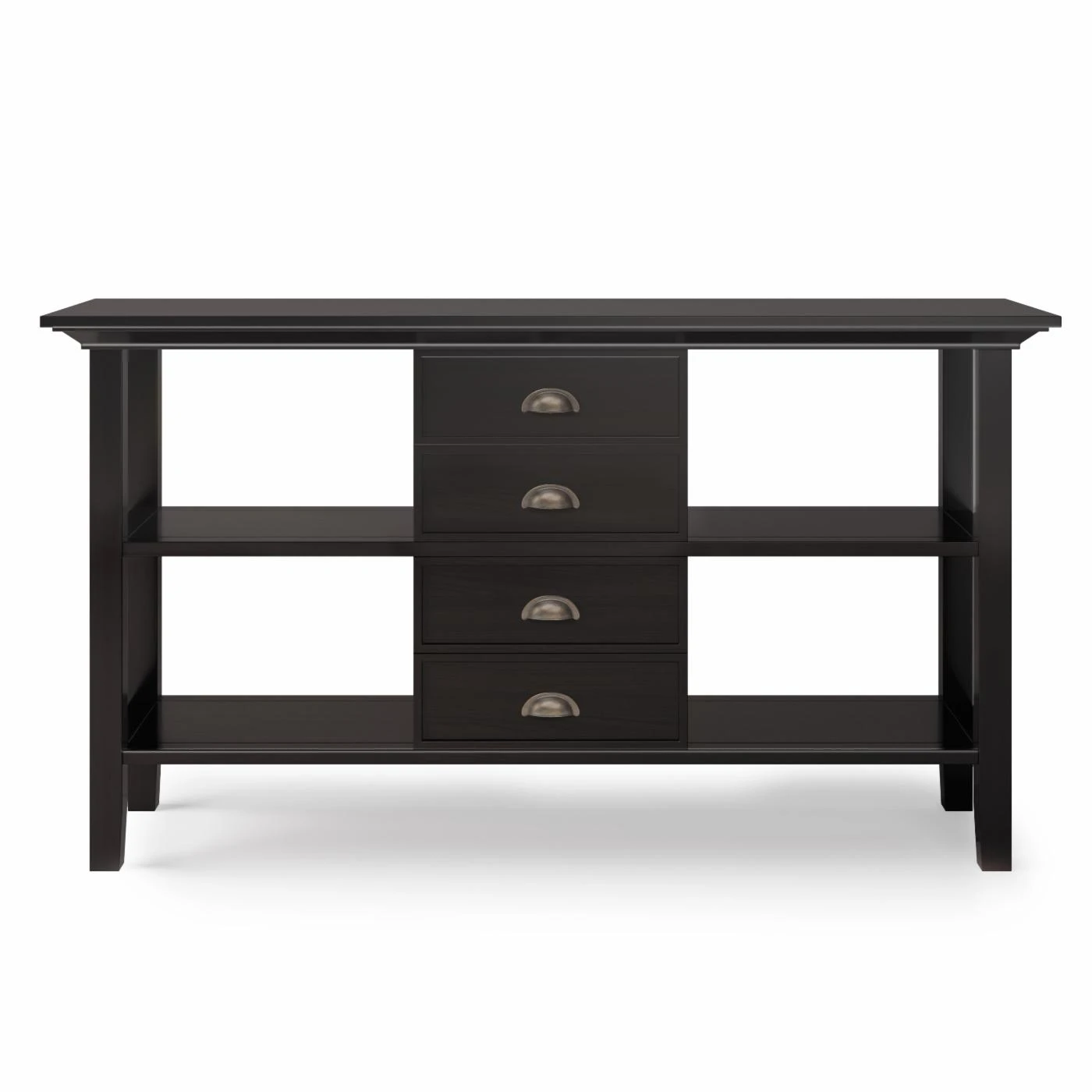 Your living space will gain plenty of storage with the Brooklyn + Max Stanwick Rustic Pine Wood Console Table. This piece has four drawers along with four compartment spaces. The molded crown top and slightly tapered legs complement the style of this console table.