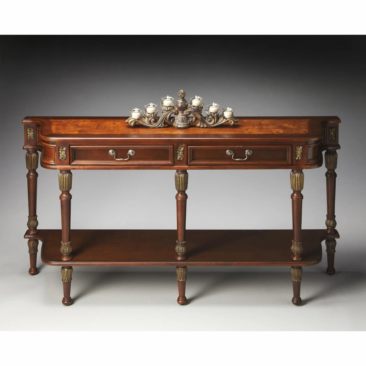 The Hallmark Console Table features select solid wood construction with hand-carved detailing. A stylish cherry and olive ash burl veneer creates a handsome addition to your living space designs. Resin components and gold-tipped accents impart a classical quality onto the spacious frame. Both drawers feature antique brass finished hardware. Hand-crafted styling ensures an overall timeless piece.