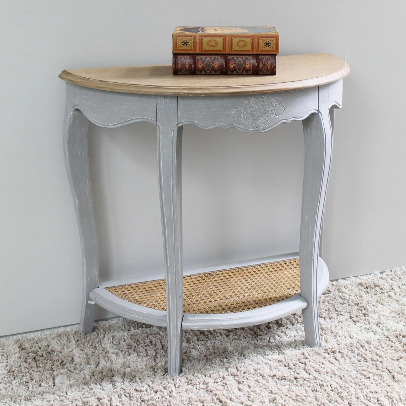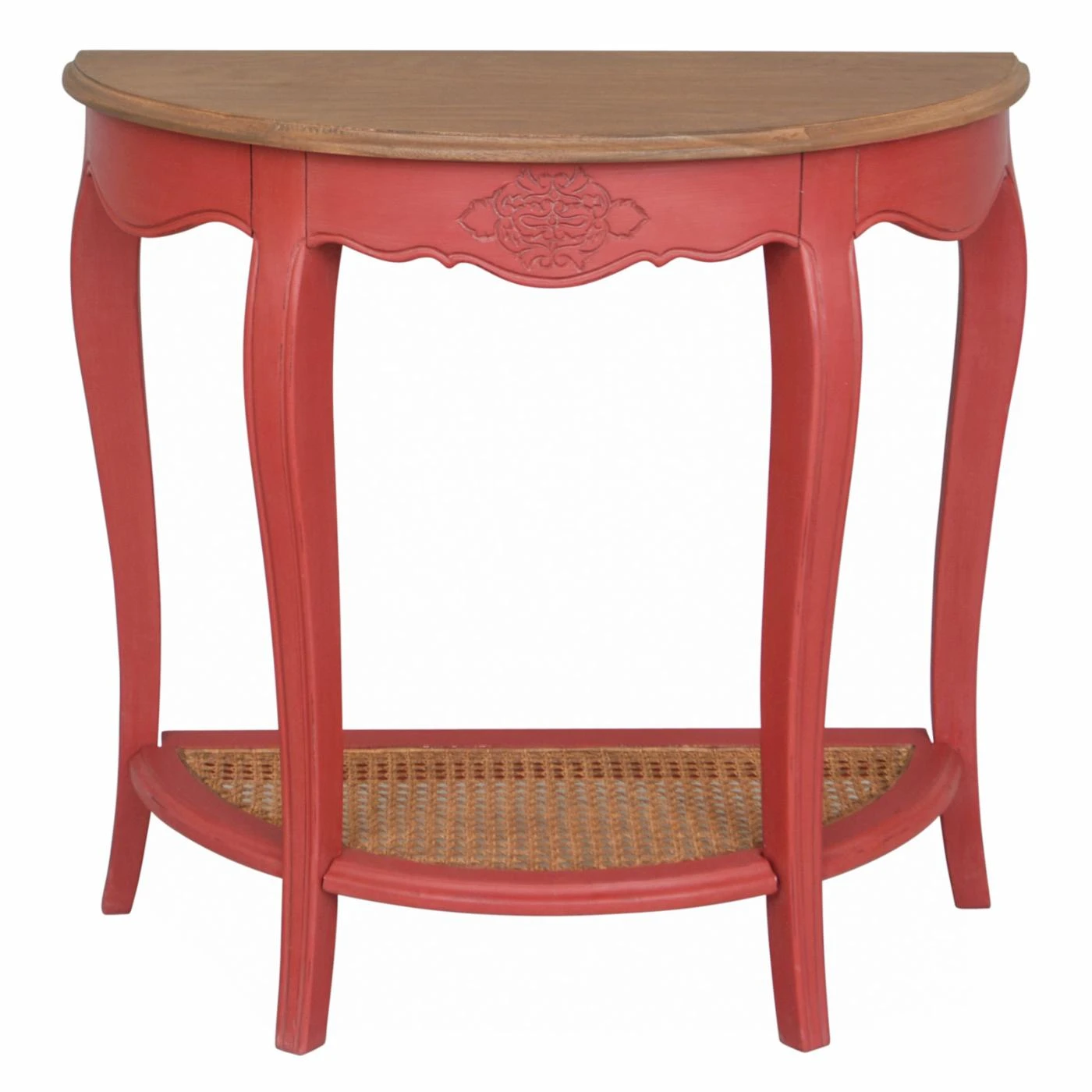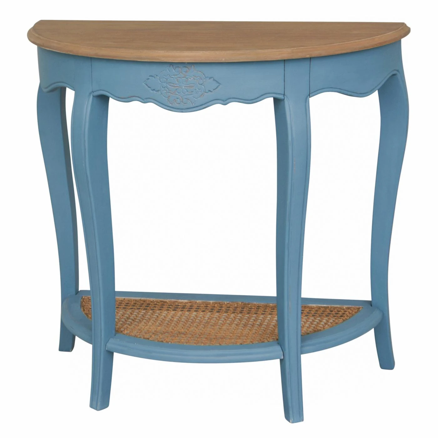 The International Caravan Ashbury Half Moon 2 Tier Wood Console Table is as pretty as it is French provincial. Its hardwood base boasts shapely cabriole legs and a scalloped apron detailed with a delicate floral carving, all painted in the available color of your choice. On top is a warm, natural-hue demilune wood veneer tabletop, and below is an open shelf outfitted with a woven rattan inset. Casual and elegant, this piece is a perfect pick for the hallway, entryway, or sofa back. Assembly is required; all hardware is included.