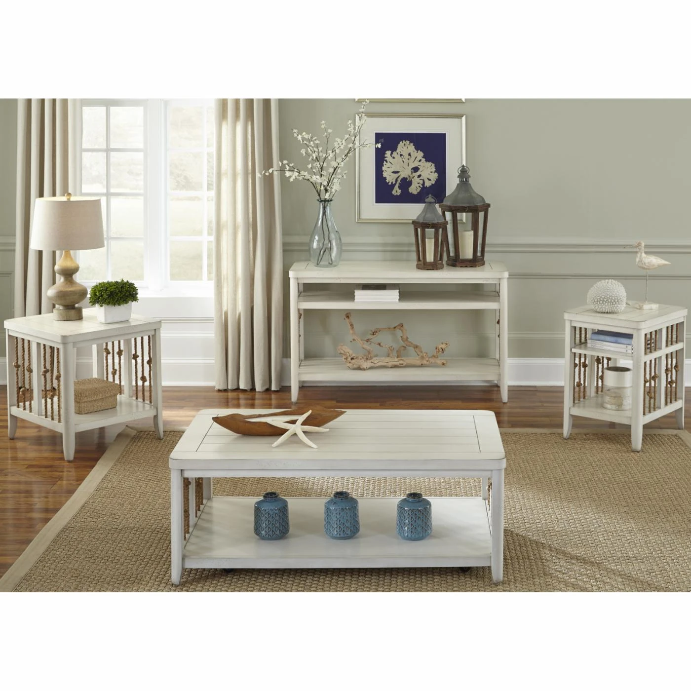If youβve noticed most nautical furnishings go a little, well, overboard, the understated coastal charm of the Liberty Furniture Dockside II Sofa Table just might be exactly what youβve been searching for. Made of solid poplar with birch veneers, itβs finished in a classic white that pairs perfectly with the planked top. And youβll love the end panels – theyβre made of knotted rope. Plus, two lower shelves let you display everything from a potted plant to a chunk of driftwood. For the complete look, check out other pieces in Libertyβs Dockside II collection.