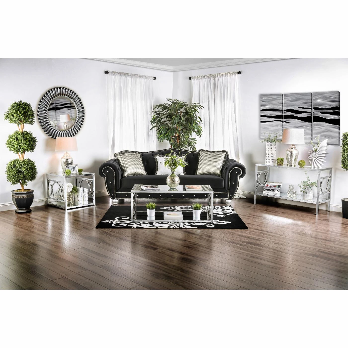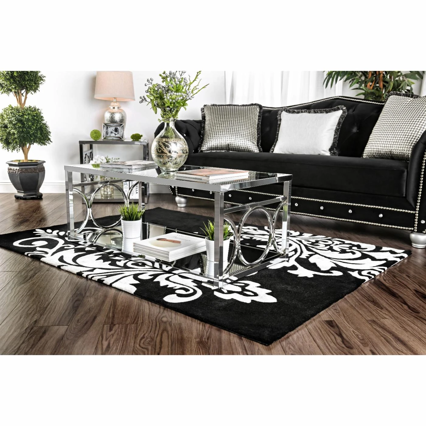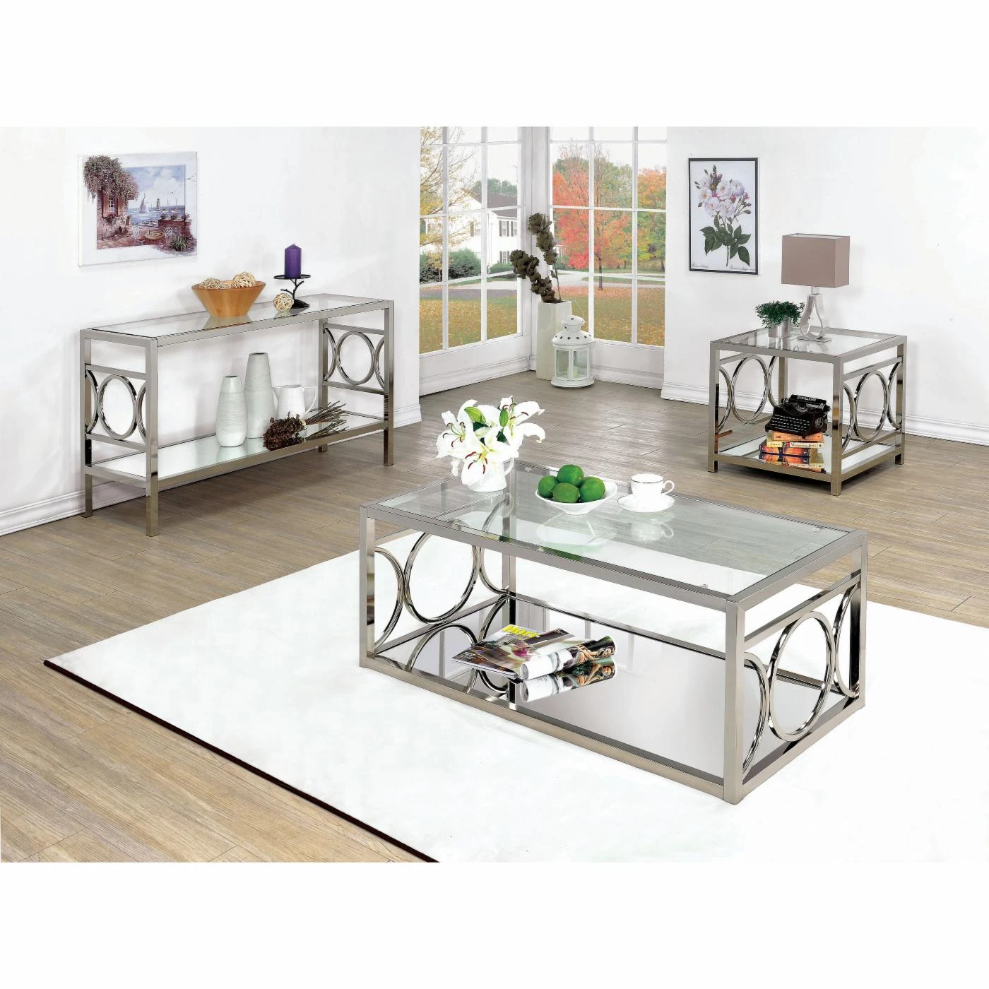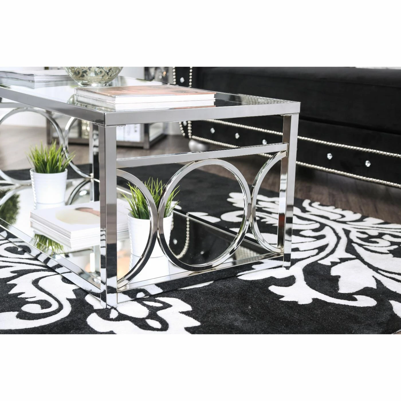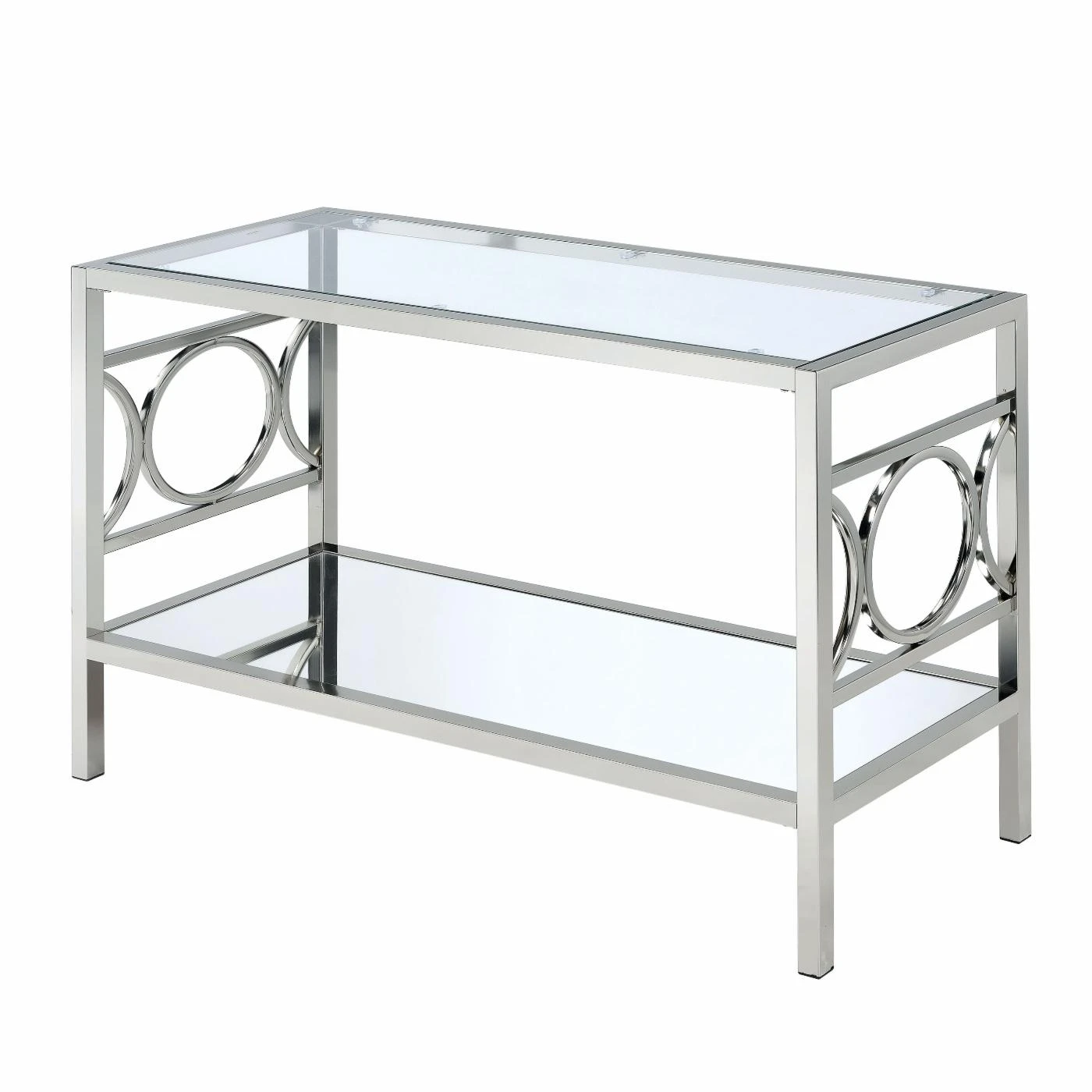 Stellar craftsmanship is evident in this Furniture of America Nadya Circle Accented Sofa Table. Supported by a metal frame and featuring a tempered glass tabletop, it’s offered in your choice of available finish. It also is equipped with an open mirror shelf so you can display decorations or keep magazines and books in order.