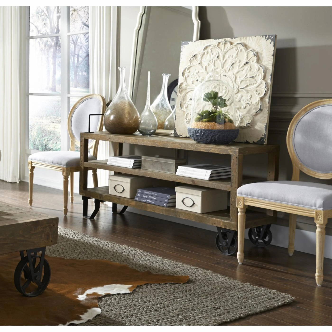 The tall, slim, and wide Modus Coalburn Reclaimed Wood Media Console is scaled to fit your entryway, hall, or may be used to display your home entertainment system. With two open shelves, it offers three levels of display. The top of this industrial chic media console is built of salvaged shipping pallets milled into individual tongue and groove planks. Its wheelbarrow base features two sand-cast wheels for an authentic, hand-forged look, and black powder-coated legs made of solid steel.