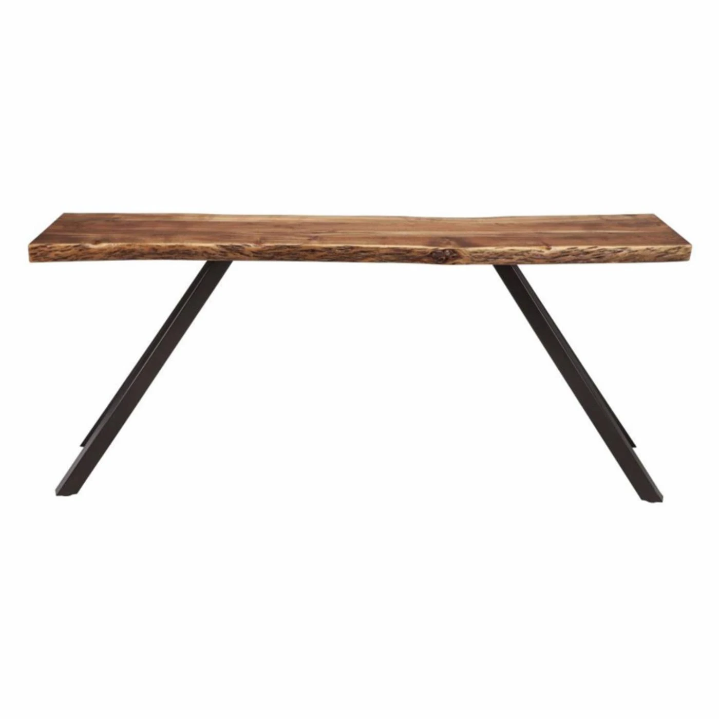 Dramatic details make the Modus Reese Rectangular Console Table a striking addition in your foyer, hall, or behind the sofa. This console table stands on dramatically angled iron legs in a powder-coated, black finish. It’s topped with a two-inch thick slab of solid acacia wood with natural live edges. A semi-gloss finish enhances the woodgrain and the natural live edges are sanded and sealed for a beautiful, splinter-free finish.