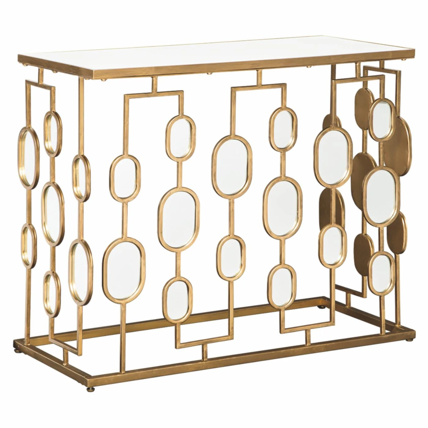 The Signature Design by Ashley Majaci 36 in. Mirrored Console Table infuses total glam into any space with its sleek base made of metal in a dazzling gold finish. Geometric shapes punctuated by mirrored details brings this console table a bright, reflective touch. A sturdy glass tabletop finishes its luxe-inspired aesthetic.