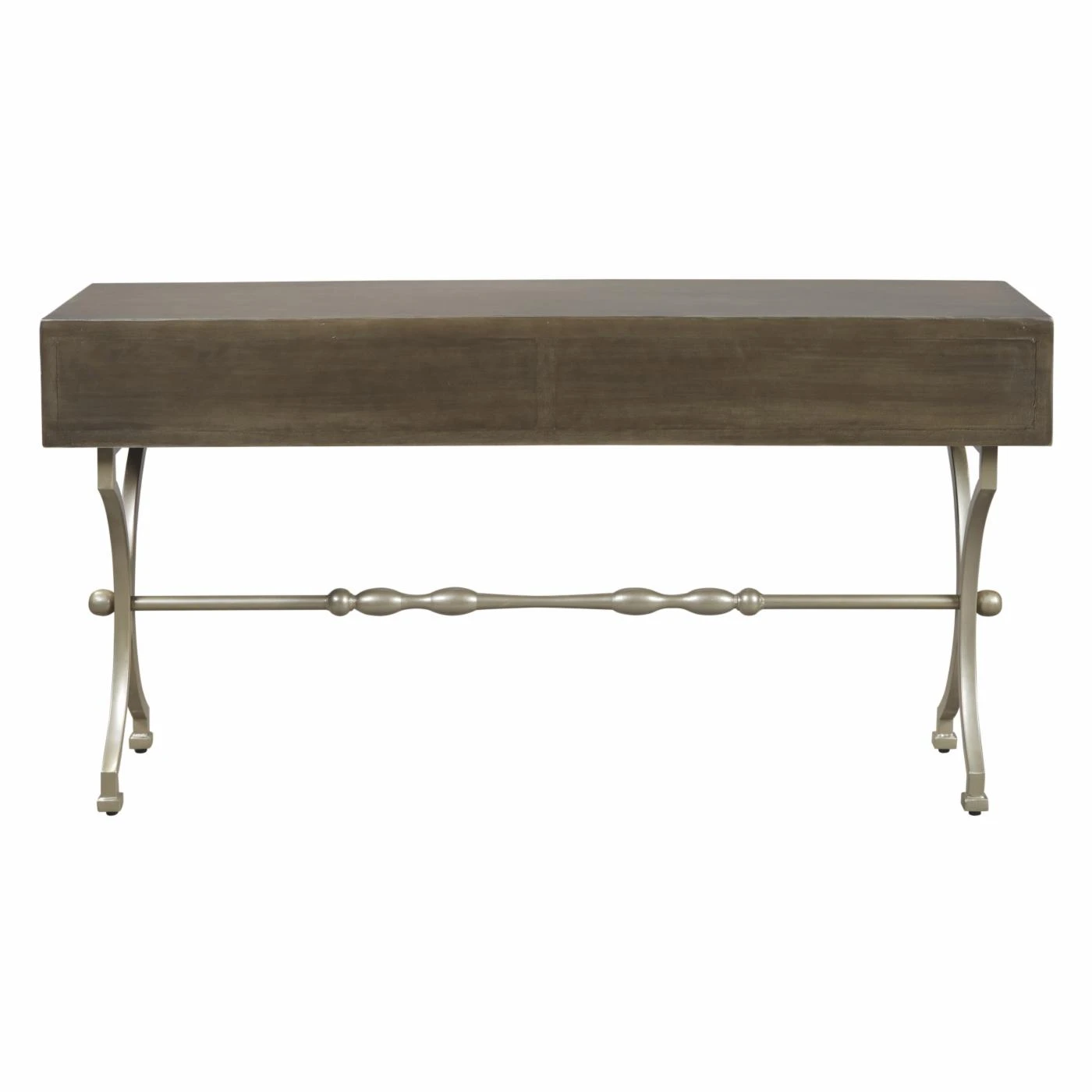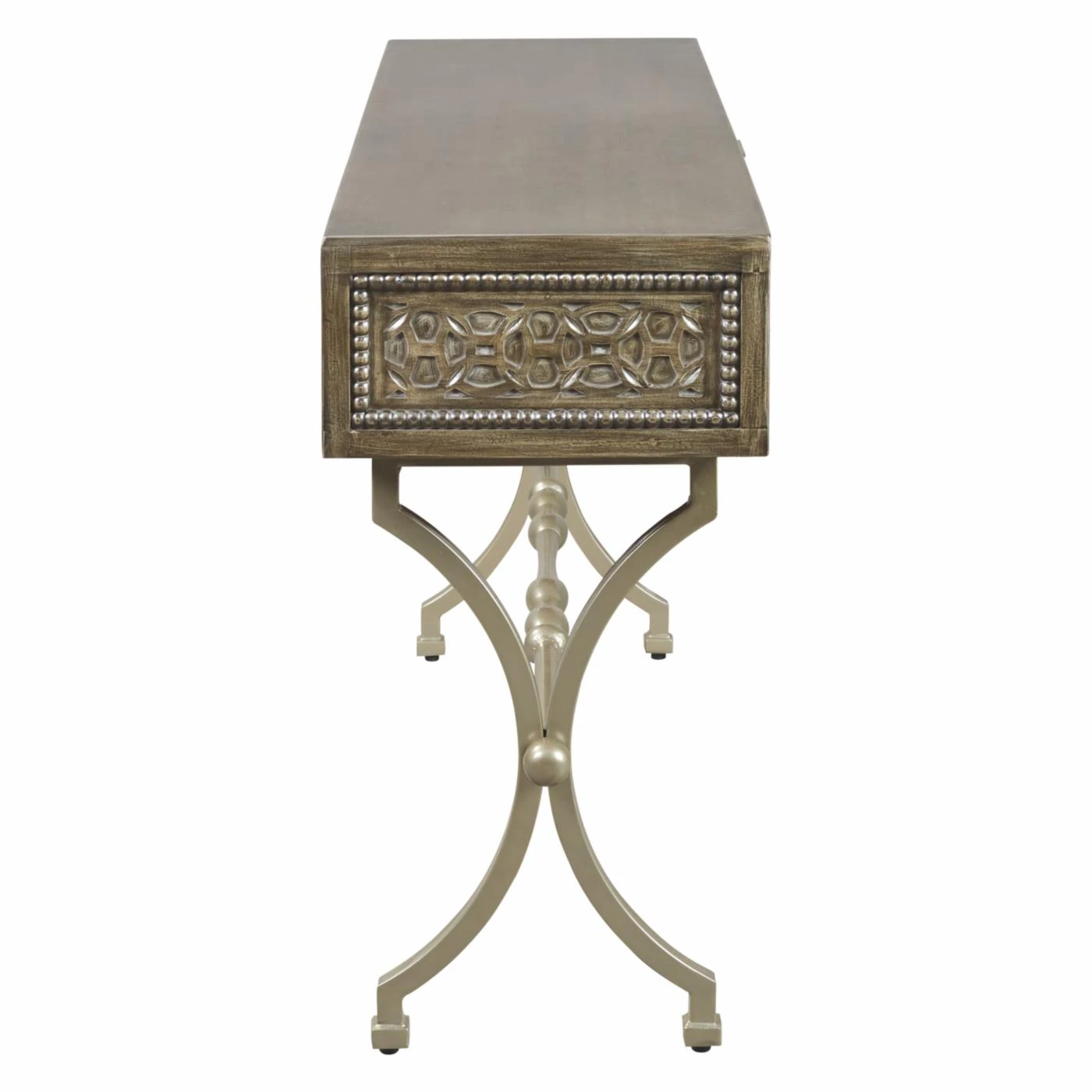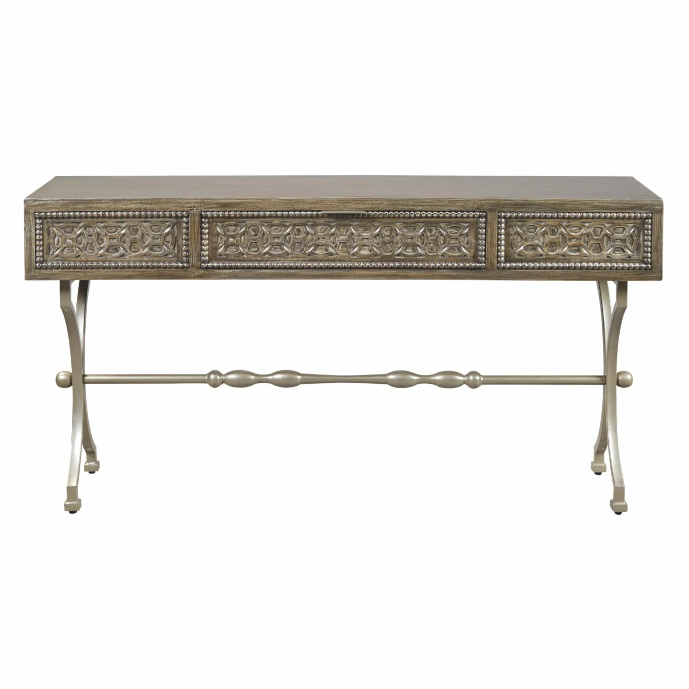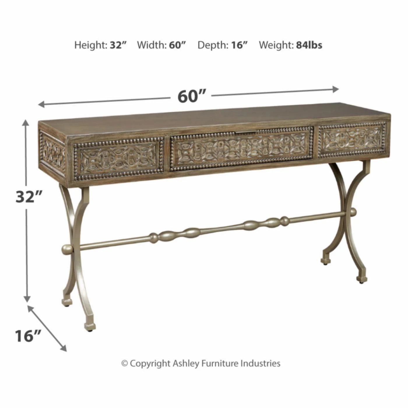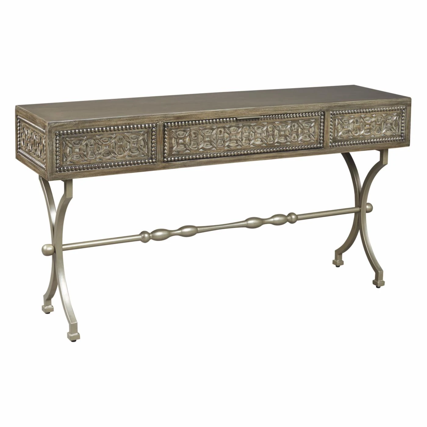 Your entryway will benefit from the graceful, striking design of the Signature Design by Ashley Quinnland Console Table. From its medallion pattern to its sculptural, X-design base, this console table has a penchant for defining a room. Its wood sports an antique gray hue that’s handsomely complemented by the champagne finish of the metal base. One drawer provides you with handy storage space while the spacious top can be home to your favorite decorative pieces.
