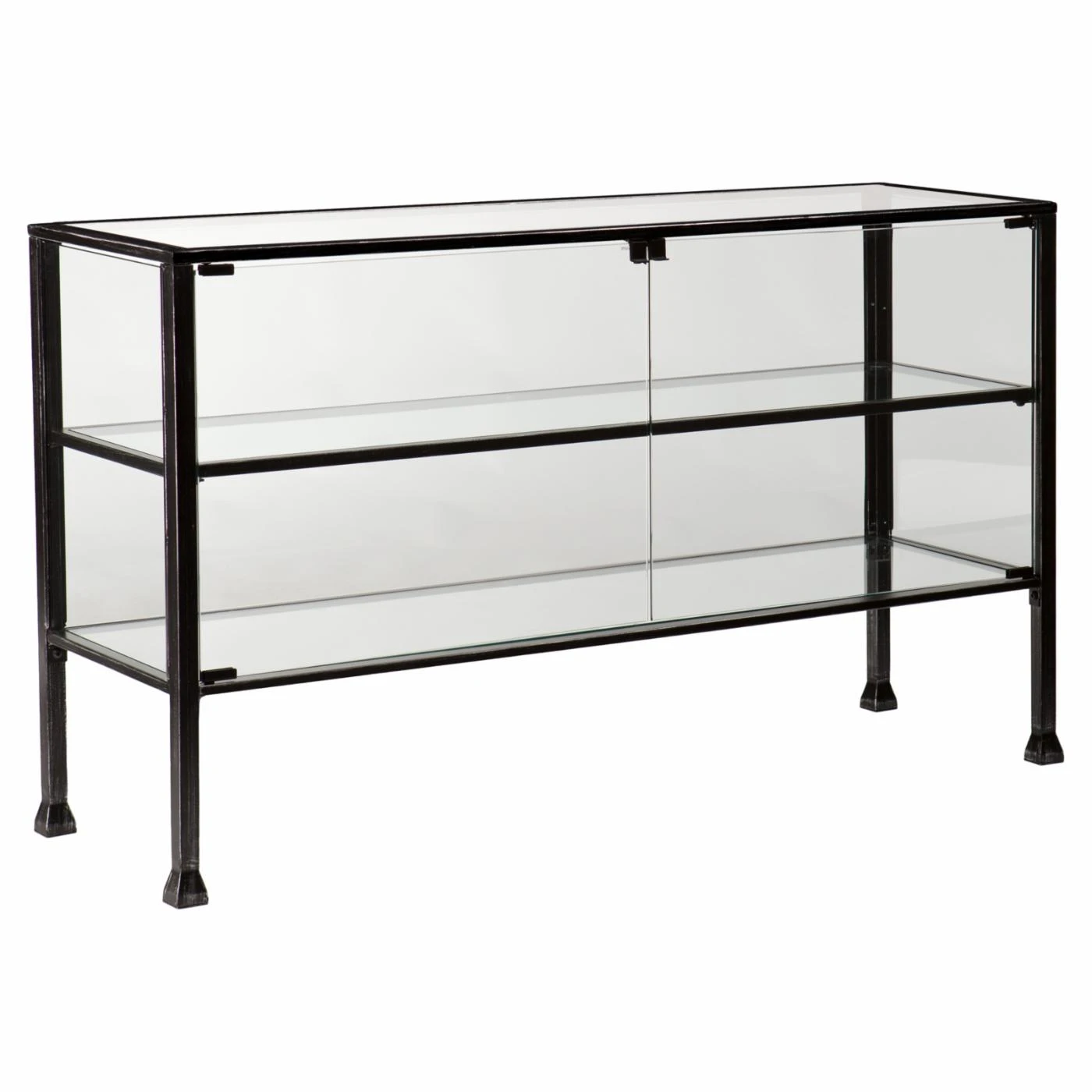 Whether you’ve got some treasured heirlooms you’d like to keep behind glass or a collection of succulents that demand attention, the Southern Enterprises Terrarium Display Curio/Console i the perfect place to show off your favorite things. This beautiful console has a wooden frame that’s finished in black with chic silver distressing. It has glass panels for a minimalist design for a museum-quality display. The double-door curio has 2 glass display shelves each with a magnetic-closure door. It’s the perfect space to display memorabilia or lowlight succulents and potted cacti no matter where it’s place in your home.