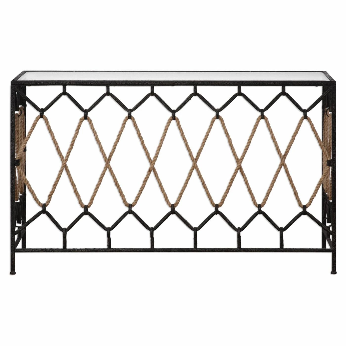 Thick nautical rope is threaded through hand-forged iron rings in this Uttermost Darya Console Table. An aged black finish adds antiqued appeal to this rustic, industrial console table. A clear glass top brings this console table into the modern age.