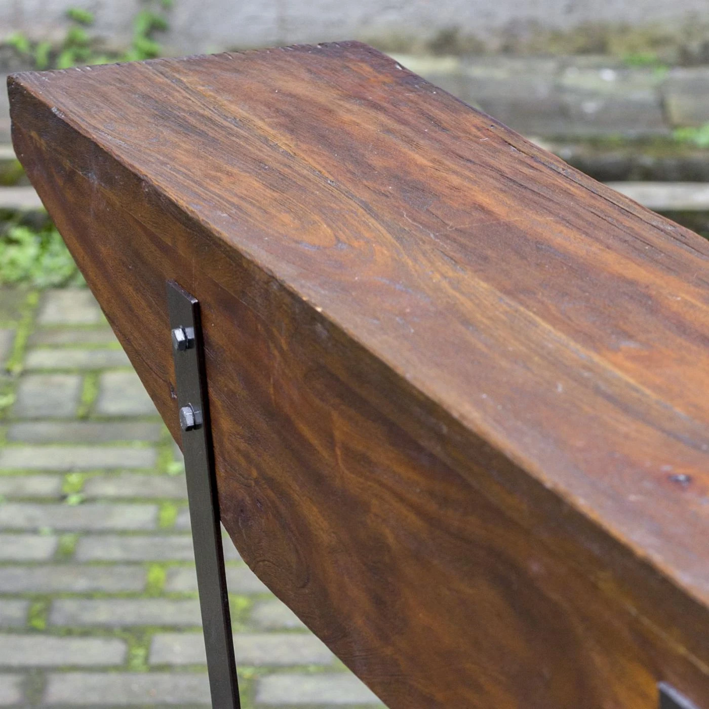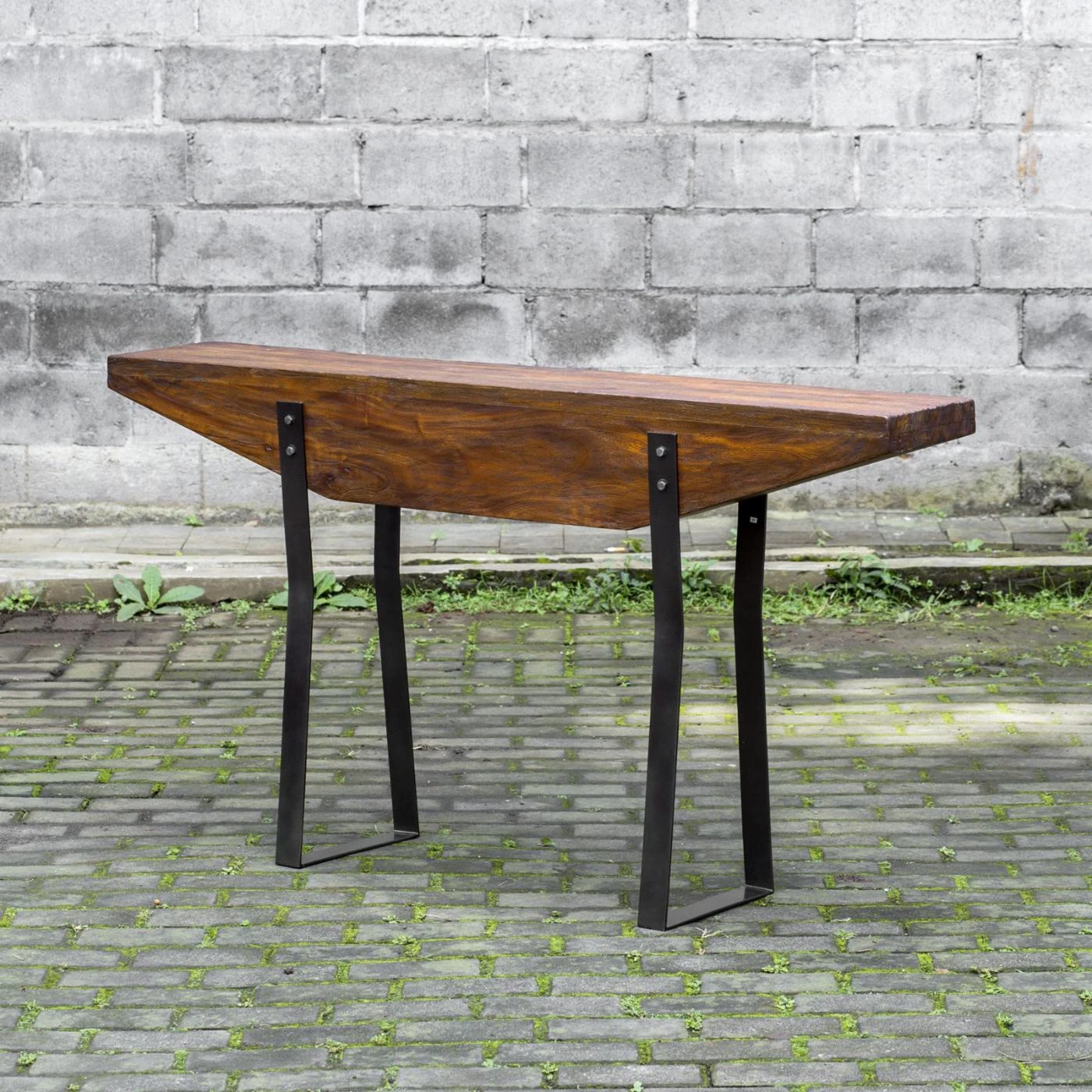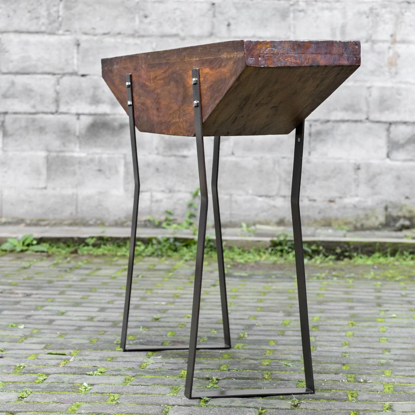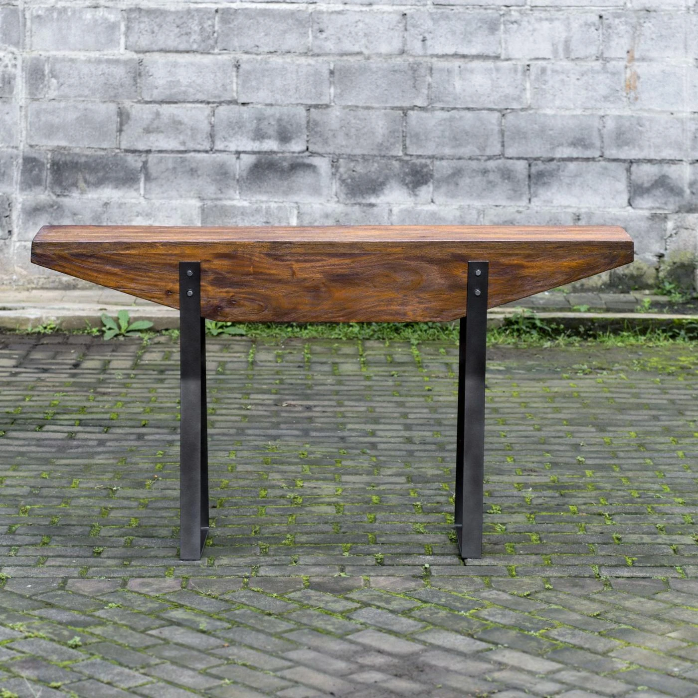 An angled slab of mahogany wood forms the Uttermost Emryn Industrial Sofa Table. This rustic sofa table boasts a sturdy base of strong iron. The frameโs warm aged bronze finish complements the weathered dark honey hue of the wood.