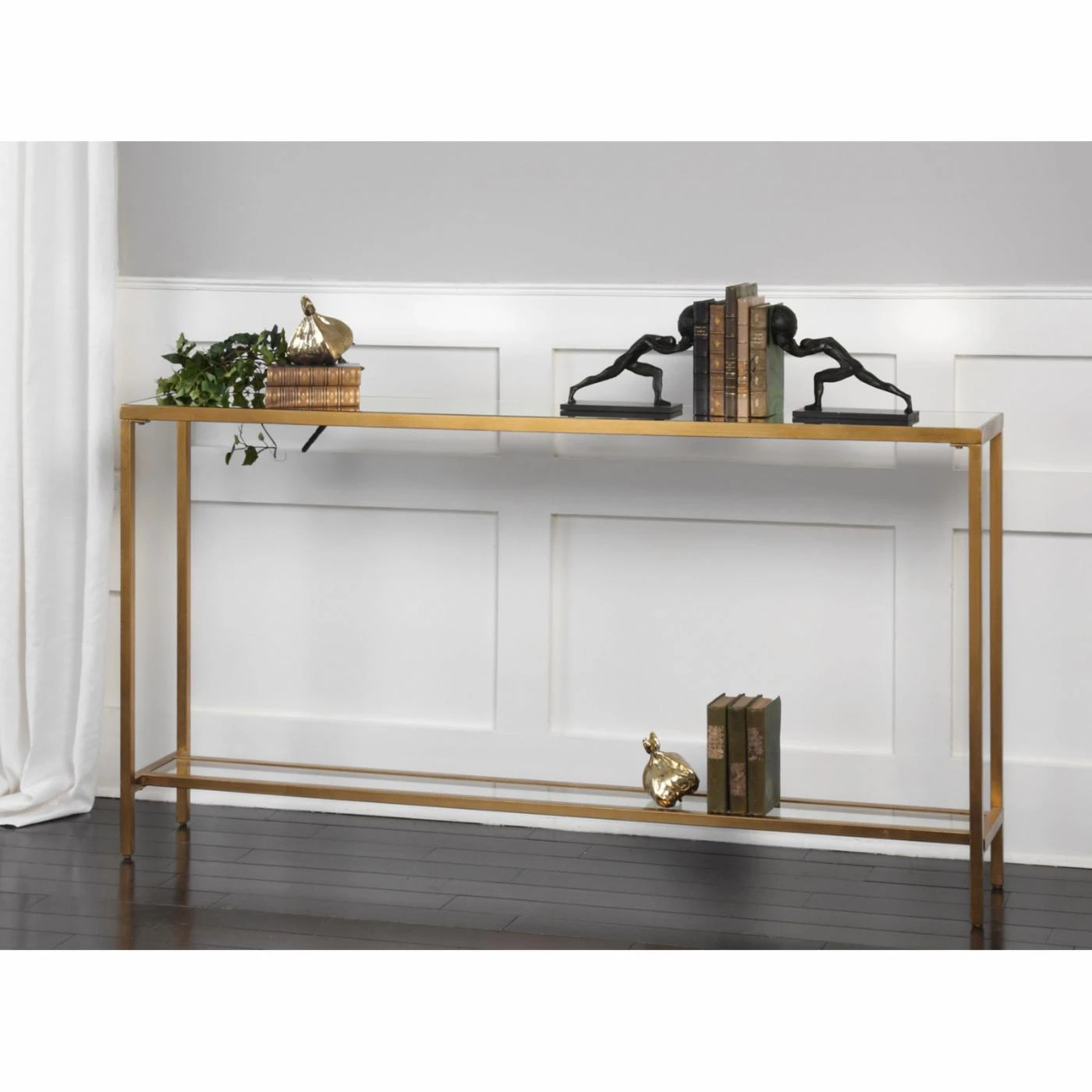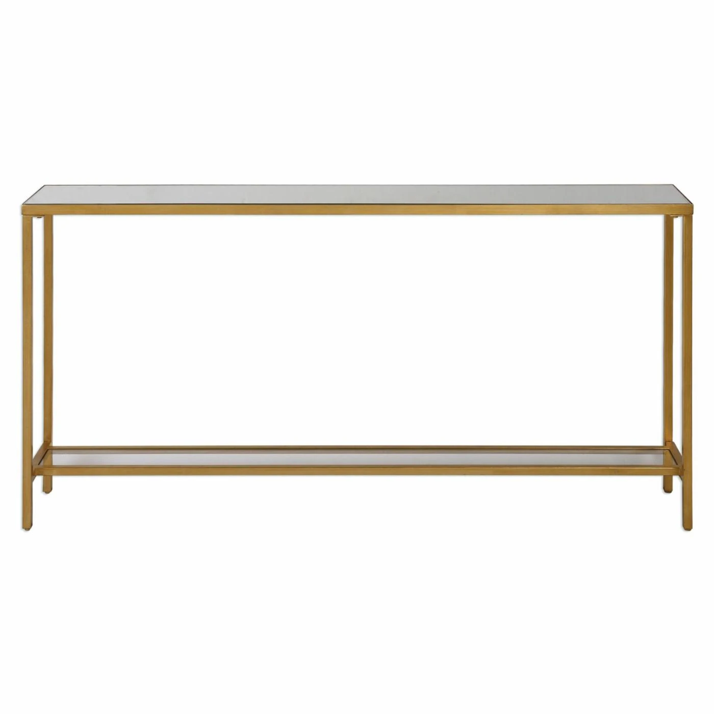 The simply glamorous Uttermost Hayley Console Table features a tall, slender design and lightly antiqued gold leaf finish. Tempered glass creates the wide top and gallery shelf below.