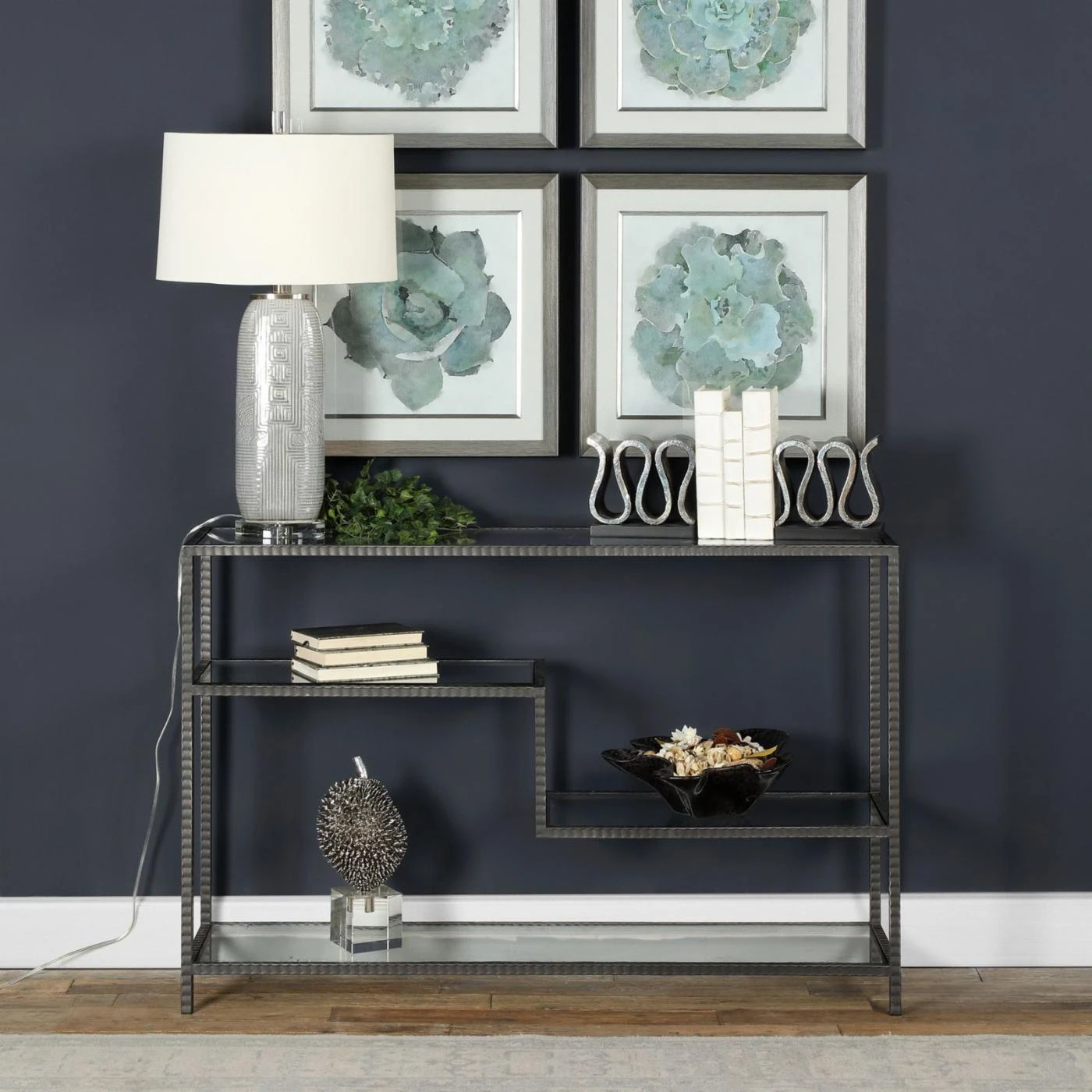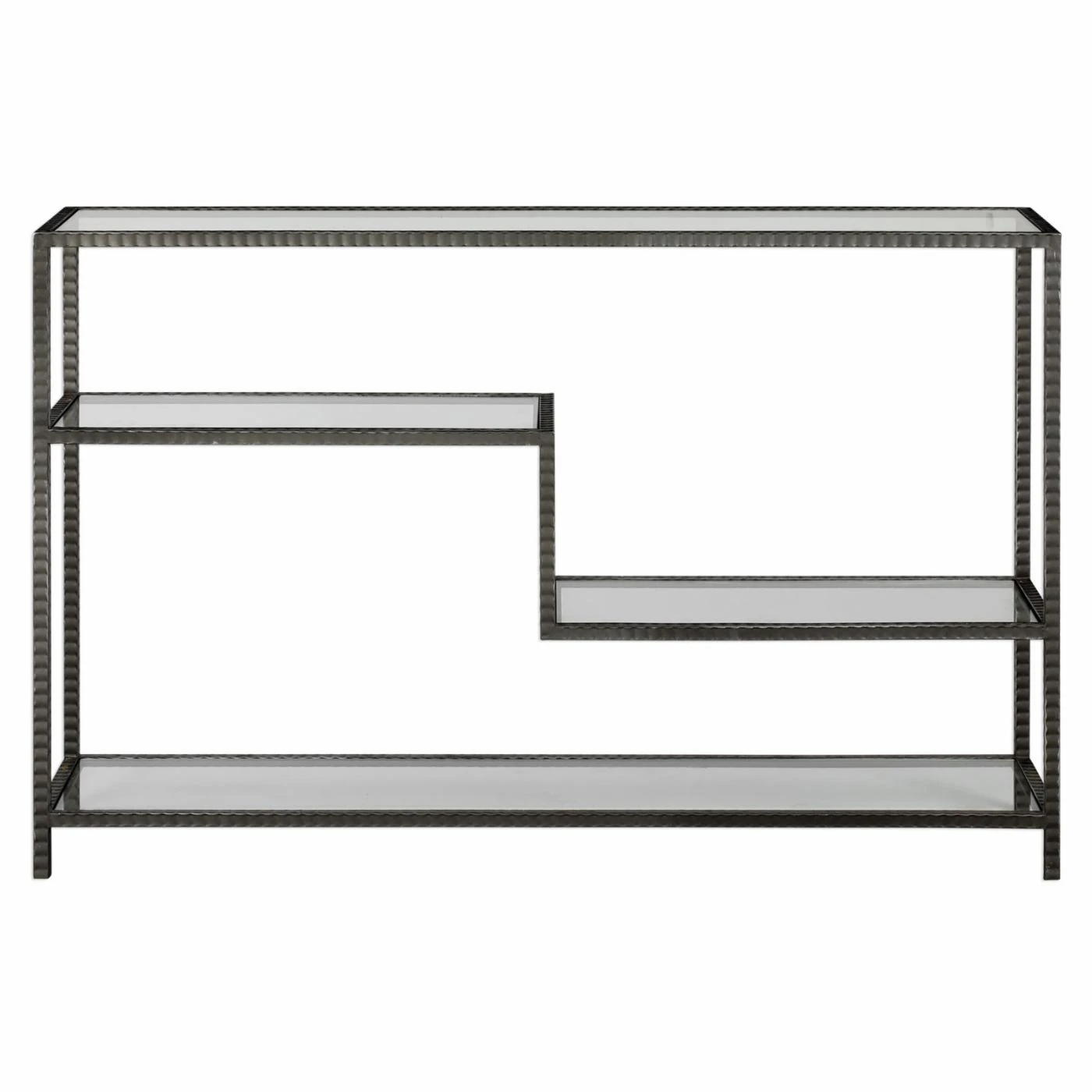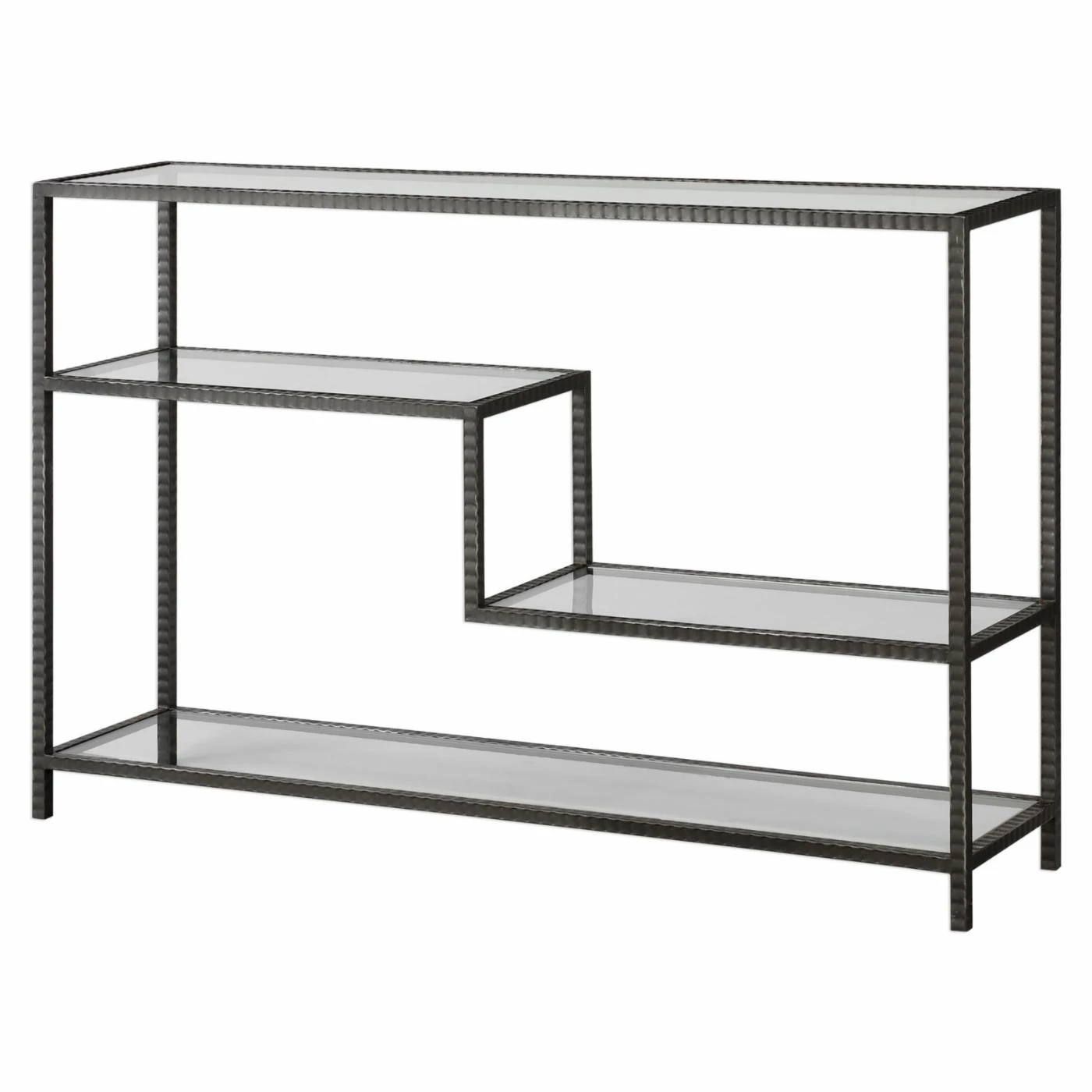 Ribbed iron in an aged gunmetal finish gives the Uttermost Leo Industrial Console Table its industrial appeal. Clear tempered glass graces the top and multi-level display shelves below. This console table is scaled tall, slim, and wide, making it perfect in your entryway, hall, or behind the sofa.