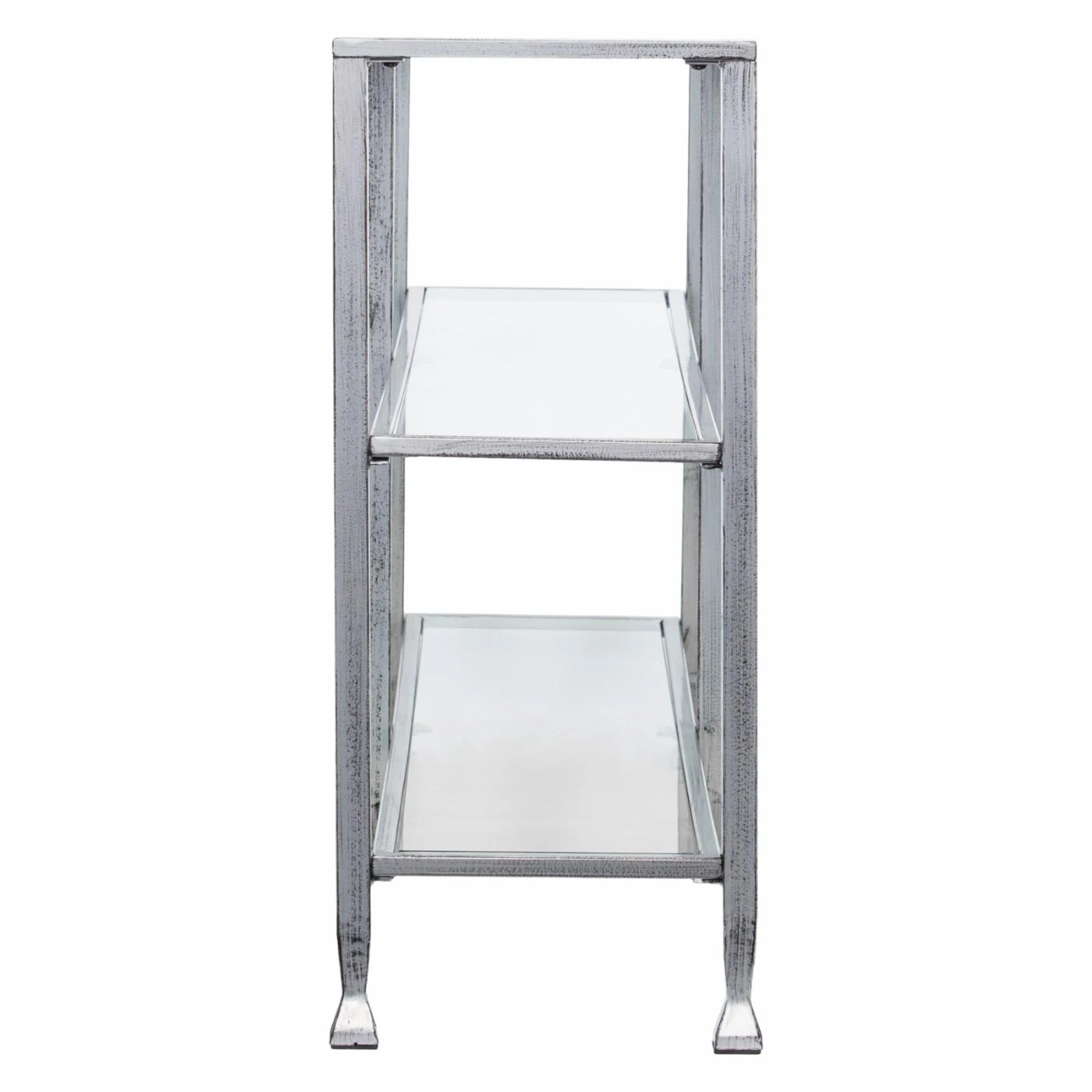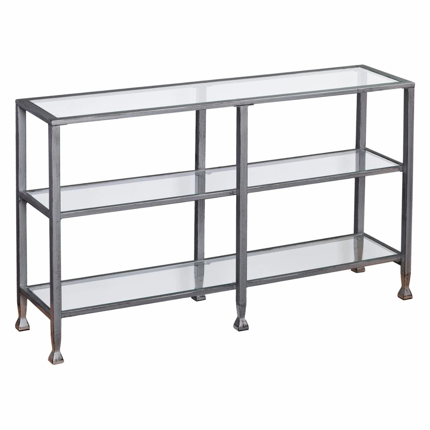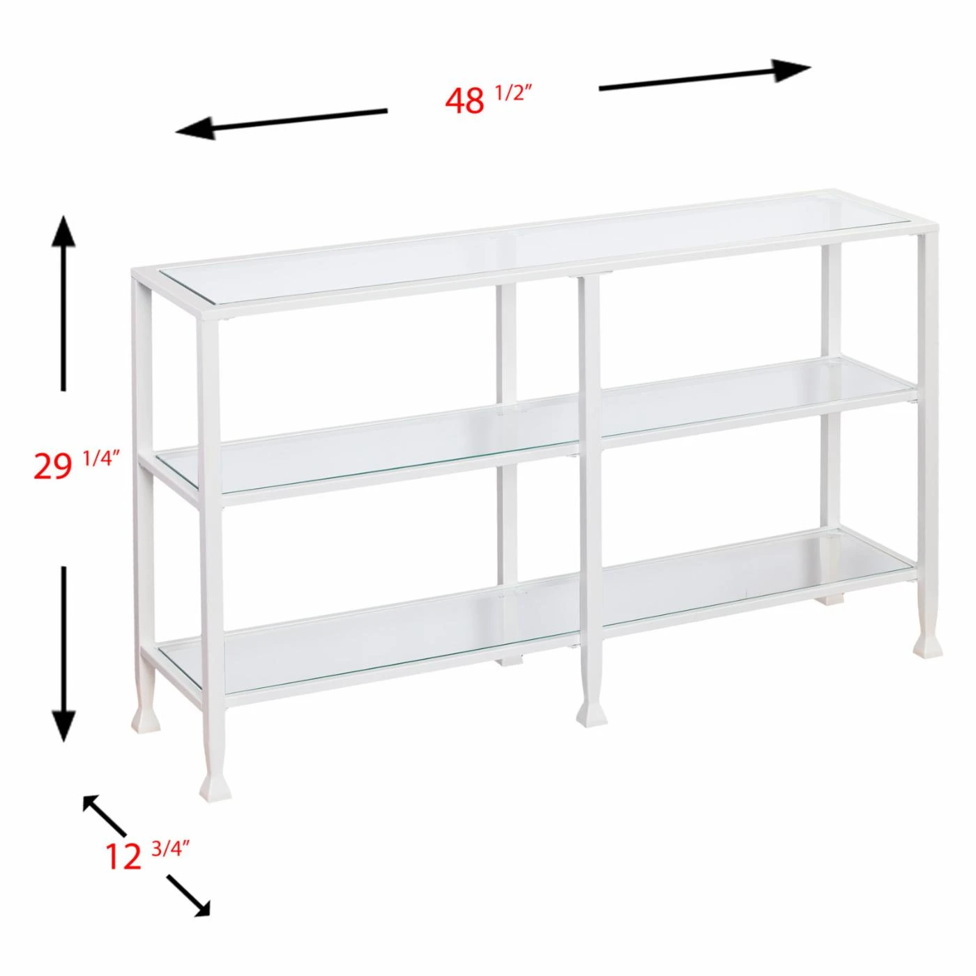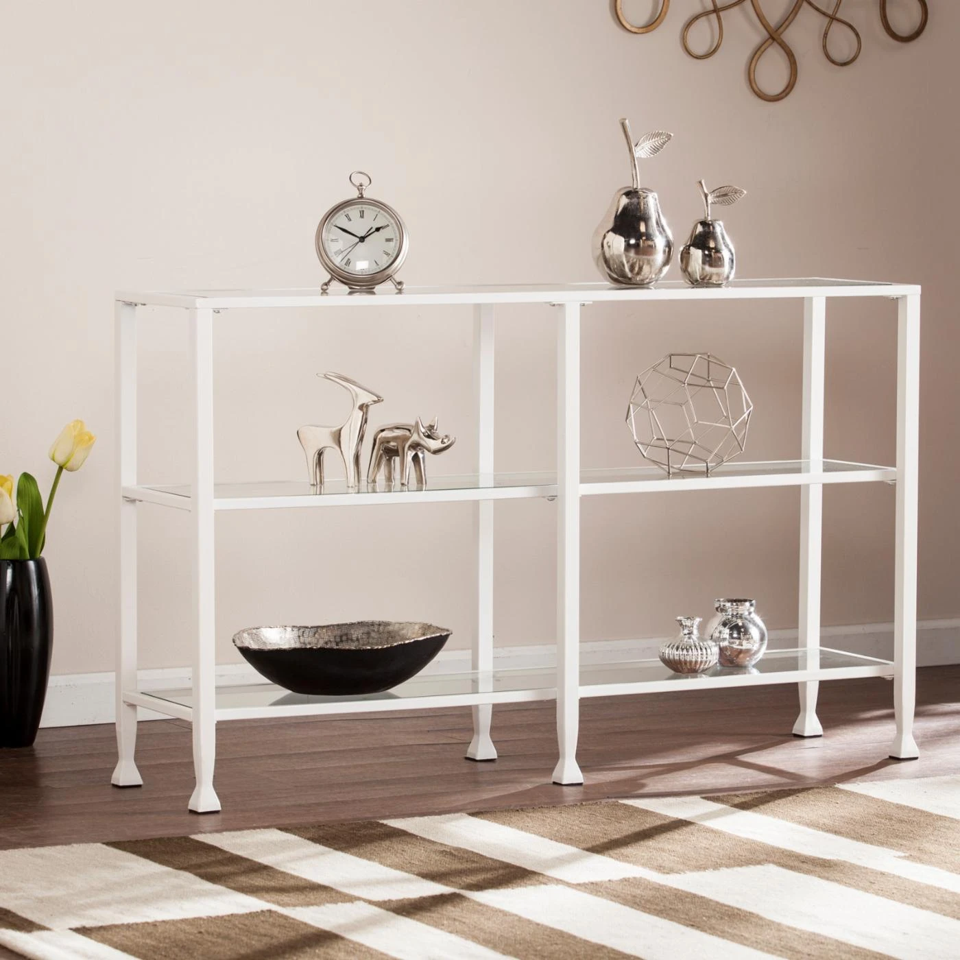 For chic versatility, this Southern Enterprises Jaymes Metal / Glass 3-Tier Console Table/Media Stand has a wide yet slim design that fit well in a hall, behind your sofa, or in the entryway. This console table is built with a slim iron frame in your choice of available powder-coated finish colors. To ensure you have plenty of display space and an open look, the table offers a tempered glass top and two shelves.