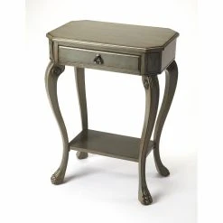The Butler Specialty Channing Console Table is a striking classical option for storage and display. This console table features a wide top, lower shelf, and pull-out drawer built into its design. The frame is constructed from sturdy wood with curved cabriole legs and is accented with fluted lines for a stylish design flourish. The wood is finished in a brushed stainless steel gray.