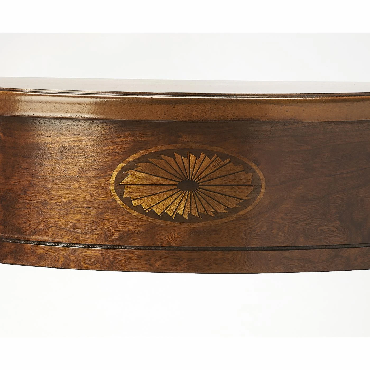 The Butler Specialty Chester Olive Ash Burl Console Table looks like it came straight out of your favorite antique store, with rich, old-world style and warm finishes. The wood table has an olive ash burl finish that provides an almost golden glow. The demilune top, fluted legs, and linen-fold inlay details give this console table all its elegant traditional appeal.