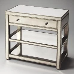 The mirrored Butler Specialty Masterpiece Miranda Console Table was designed to reflect your chic style. This console table is ideal in your entryway or the hall. It features elegant antique mirror inlays on its top, legs, drawer front, and shelves. The antique mirror gets added glamour from the striking pewter finished trim. This console table is handcrafted from select hardwood solids and wood products with antique brass-finished hardware.