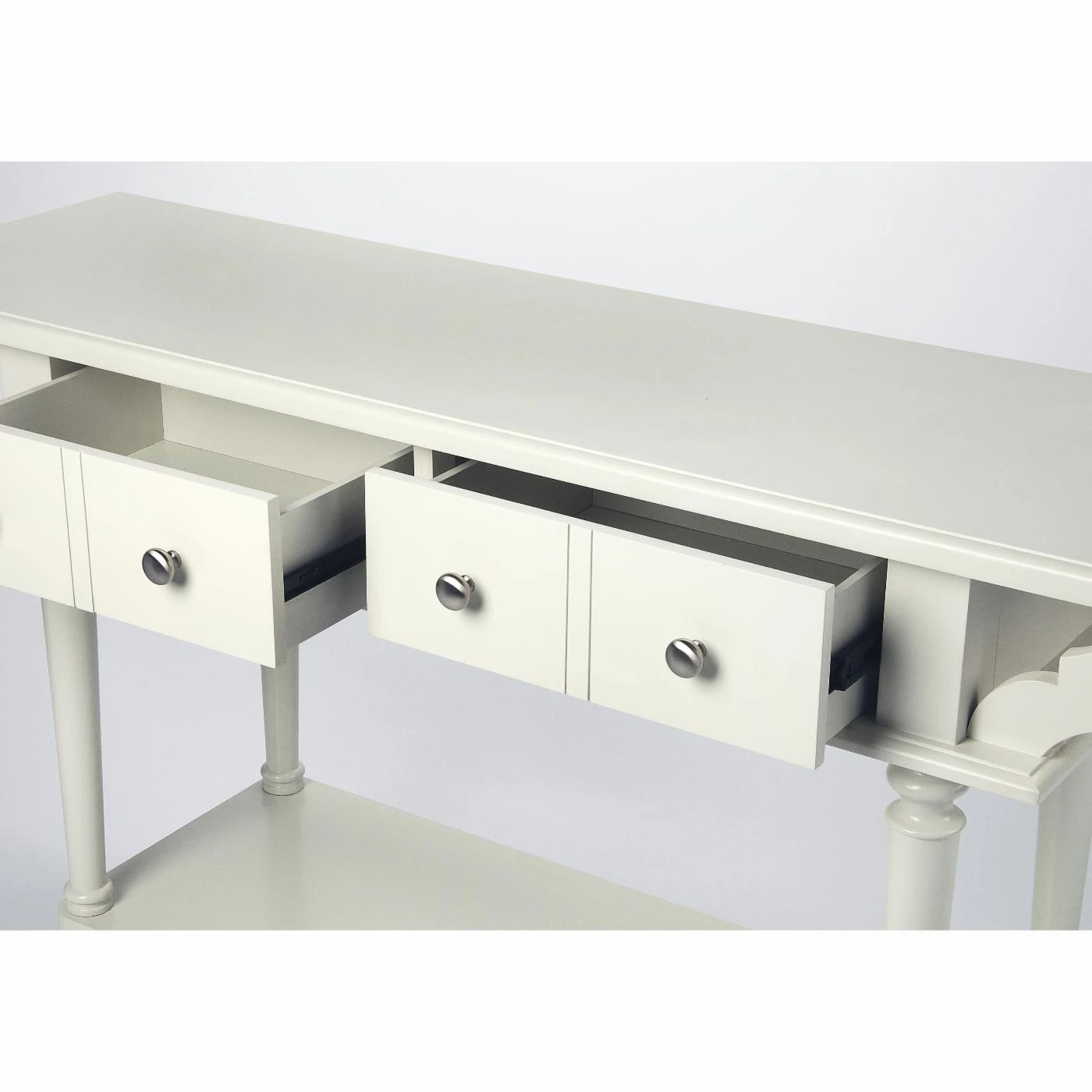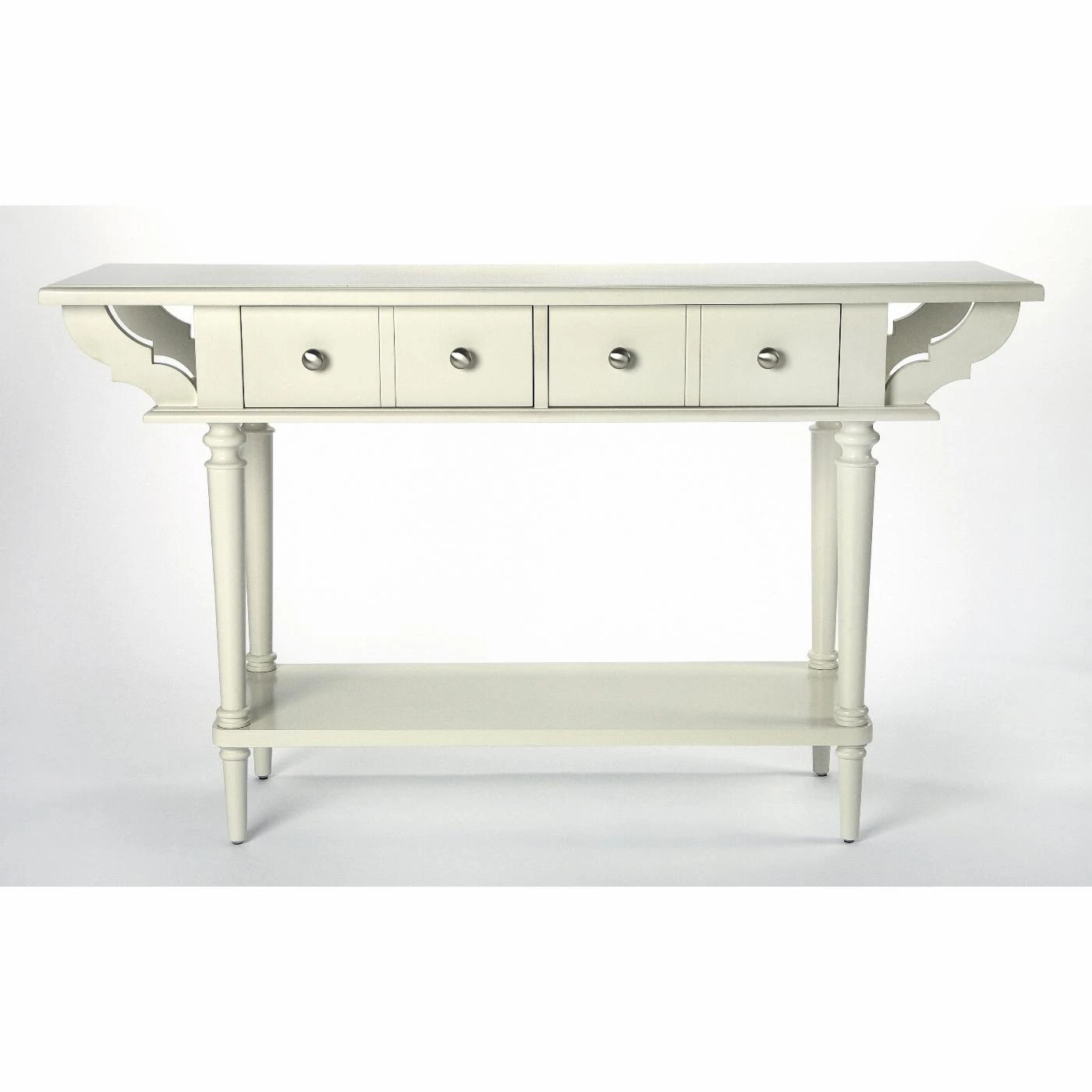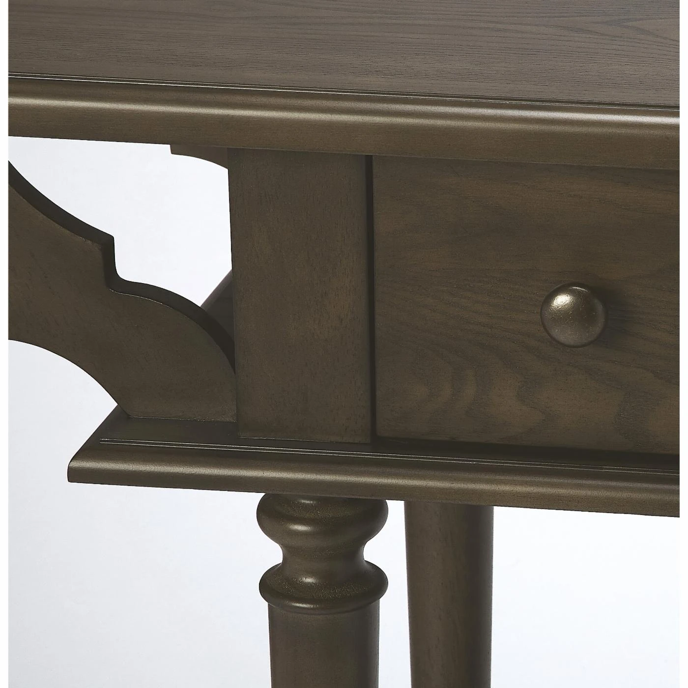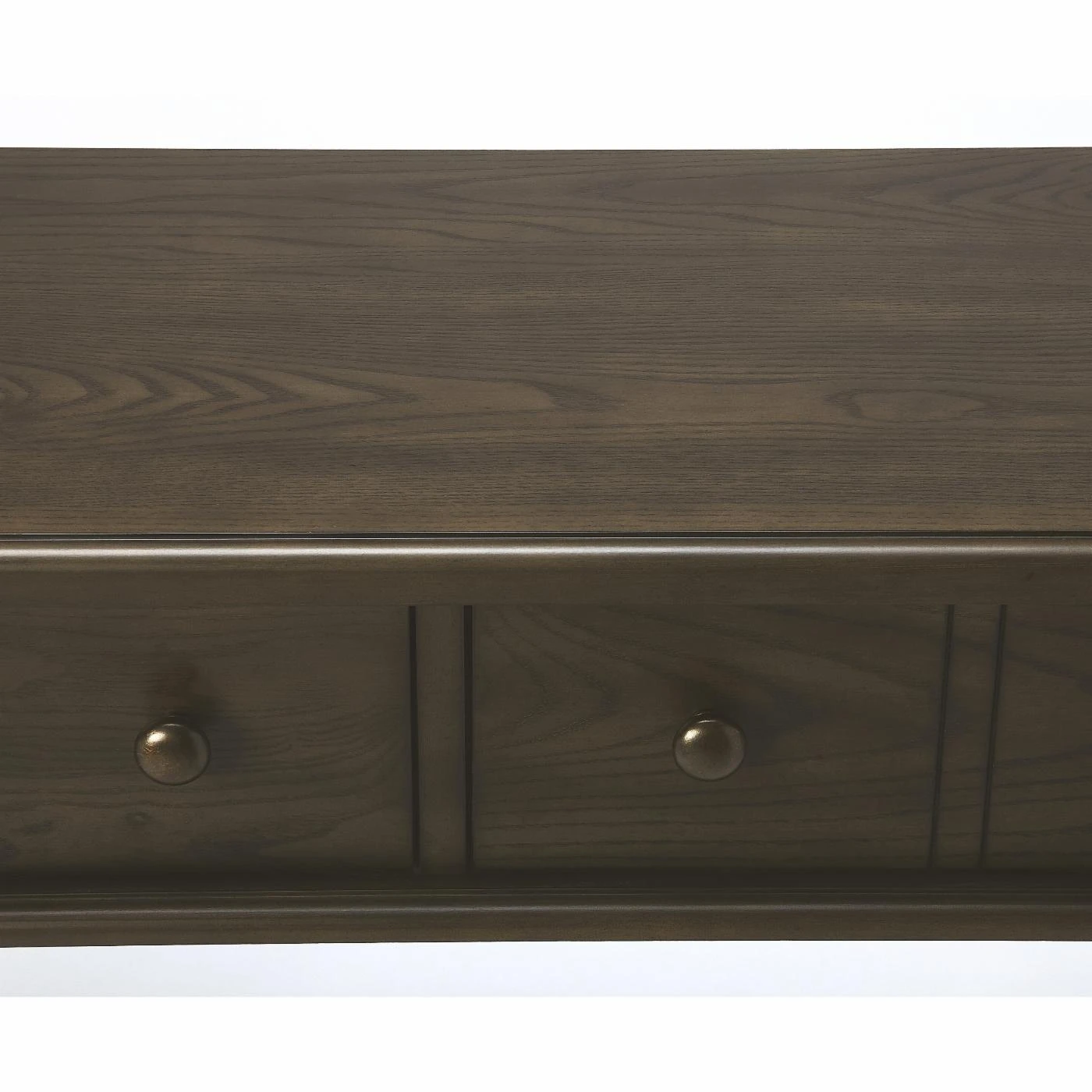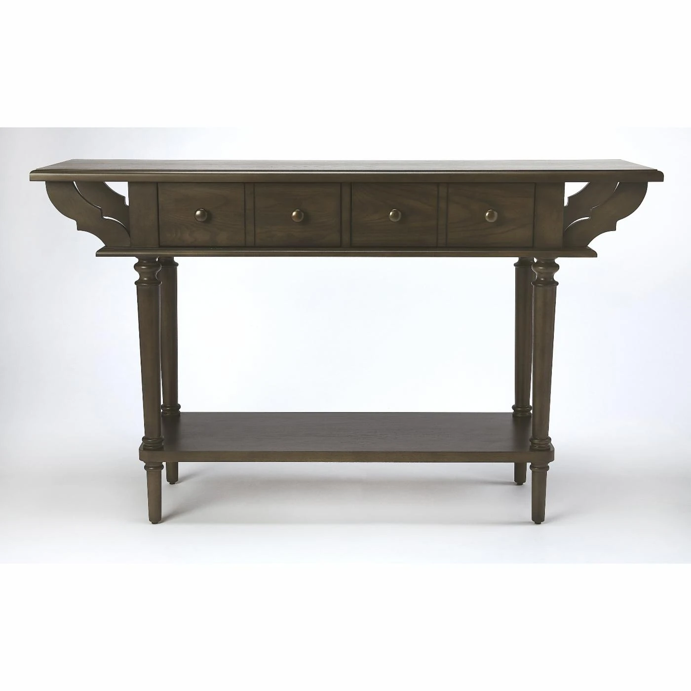 A blend of Craftsman and traditional style, the Butler Specialty Talia Console Table is an elegant, antique-inspired accent for your living room or entryway. Hang a mirror above this console table or add a pair of table lamps. Display some potted silk plants on the bottom shelf and store smaller items in the two drawers. The carved accents on each side and turned legs add plenty of dimension and classic style to this piece. Choose from available finishes.