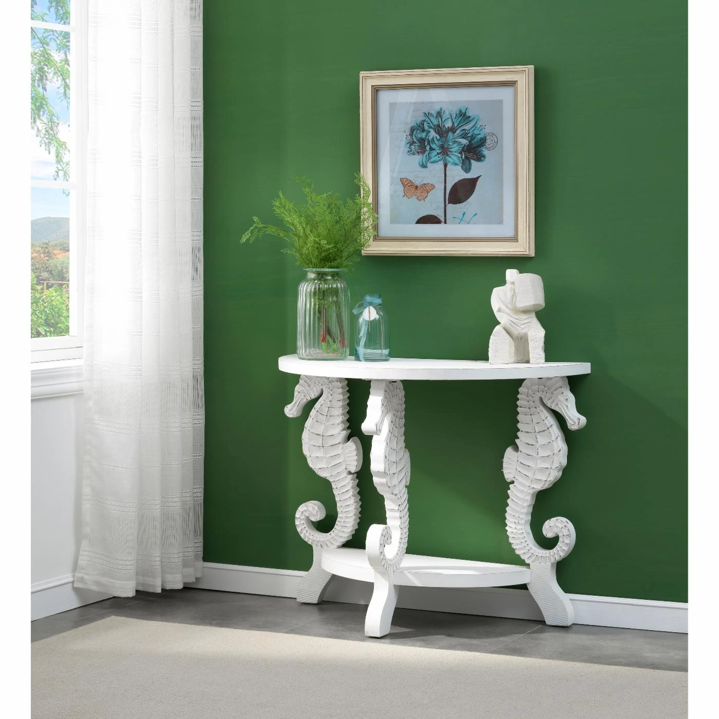 The wonders of the sea are many, and so beautiful to observe, that we just could not resist incorporating some of these into the whimsical Coast to Coast Wonders of the Sea Demilune Console Table. Finished in a brilliant Under the Sea White and with three intricately carved Sea Horses joining the top to the full lower shelf below, this table is perfect for your ocean side retreat. With a lamp on top and a few scattered seashells, this wonderful accent table is sure to bring a smile to everyone who sees it.