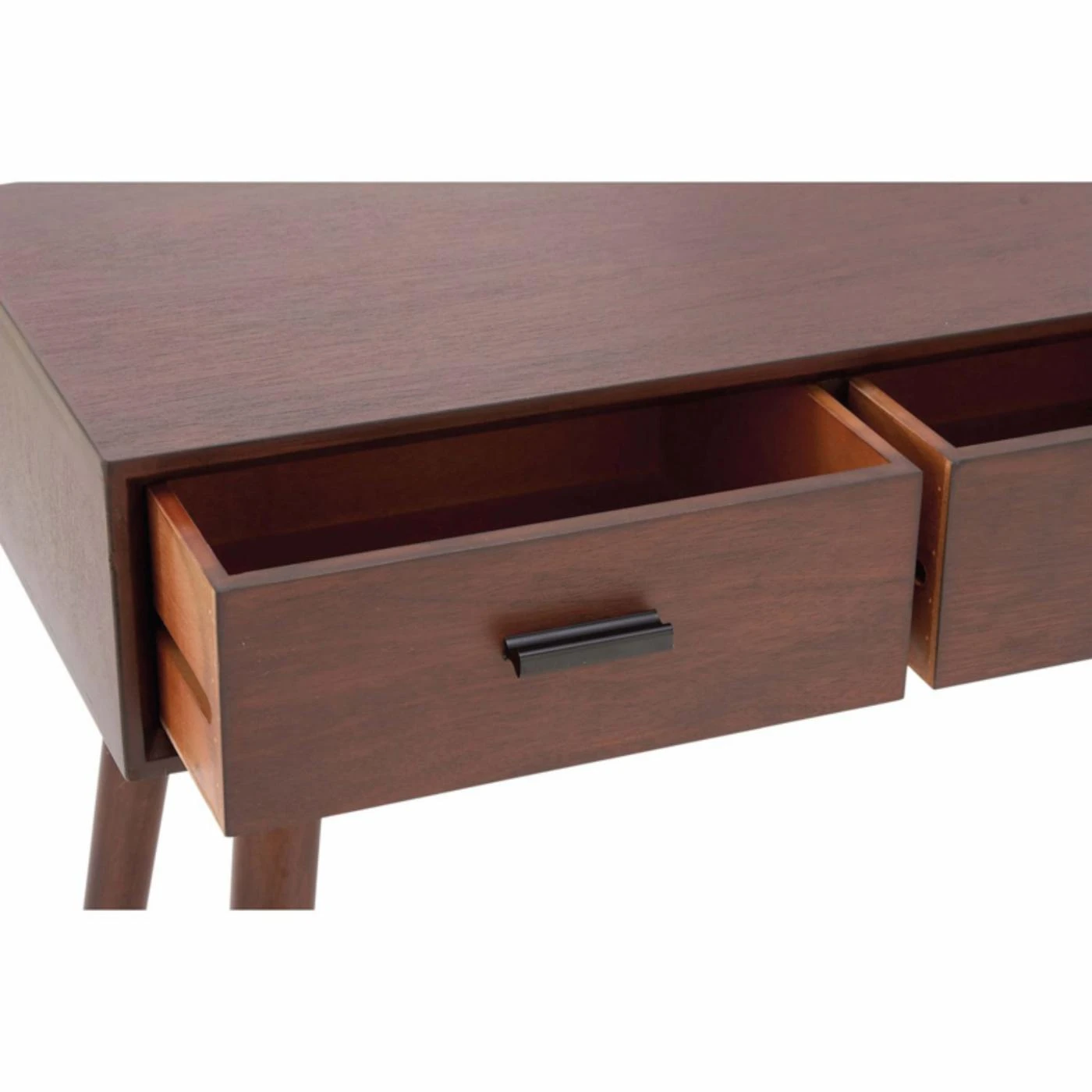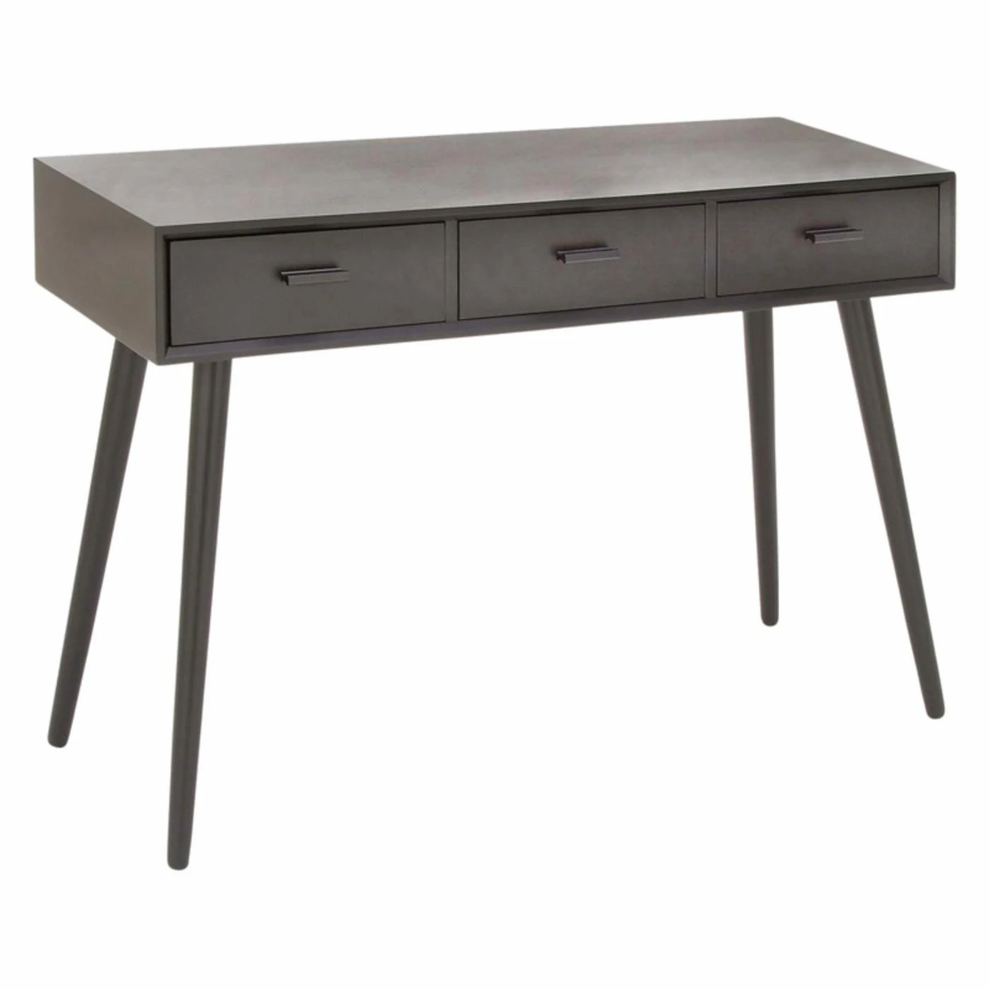 Embodying mid-mod appeal, the DecMode 3 Drawer Console Table stands on tapered and flared legs. This console table includes three drawers with slim bar pulls and is available in select finish options.