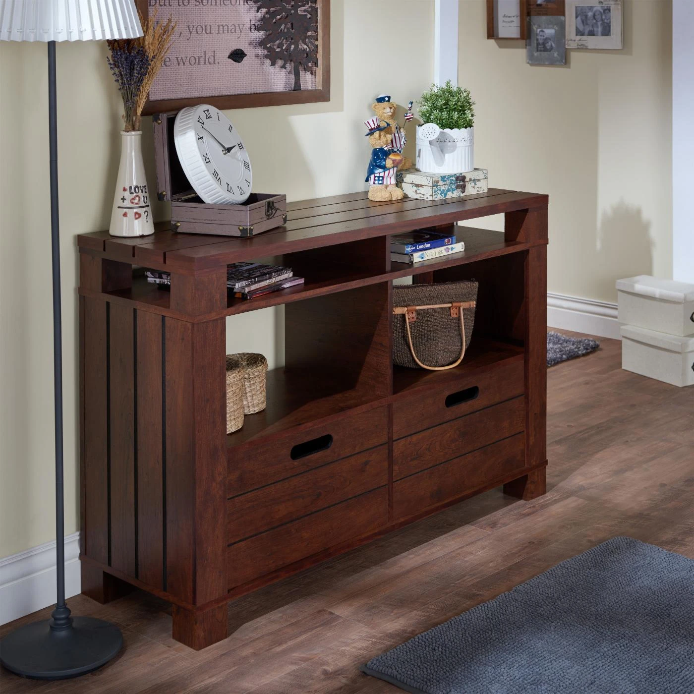 The ruggedly handsome Furniture of America Briet Rustic Storage Console Table looks like a Pinterest-perfect DIY pallet project. Only this one is a breeze to assemble. It comes in a smooth vintage walnut finish and boasts four fixed, open shelves plus two crate-look drawers with cut-out pulls. With this console table, you get all the rustic style without having to do it yourself.