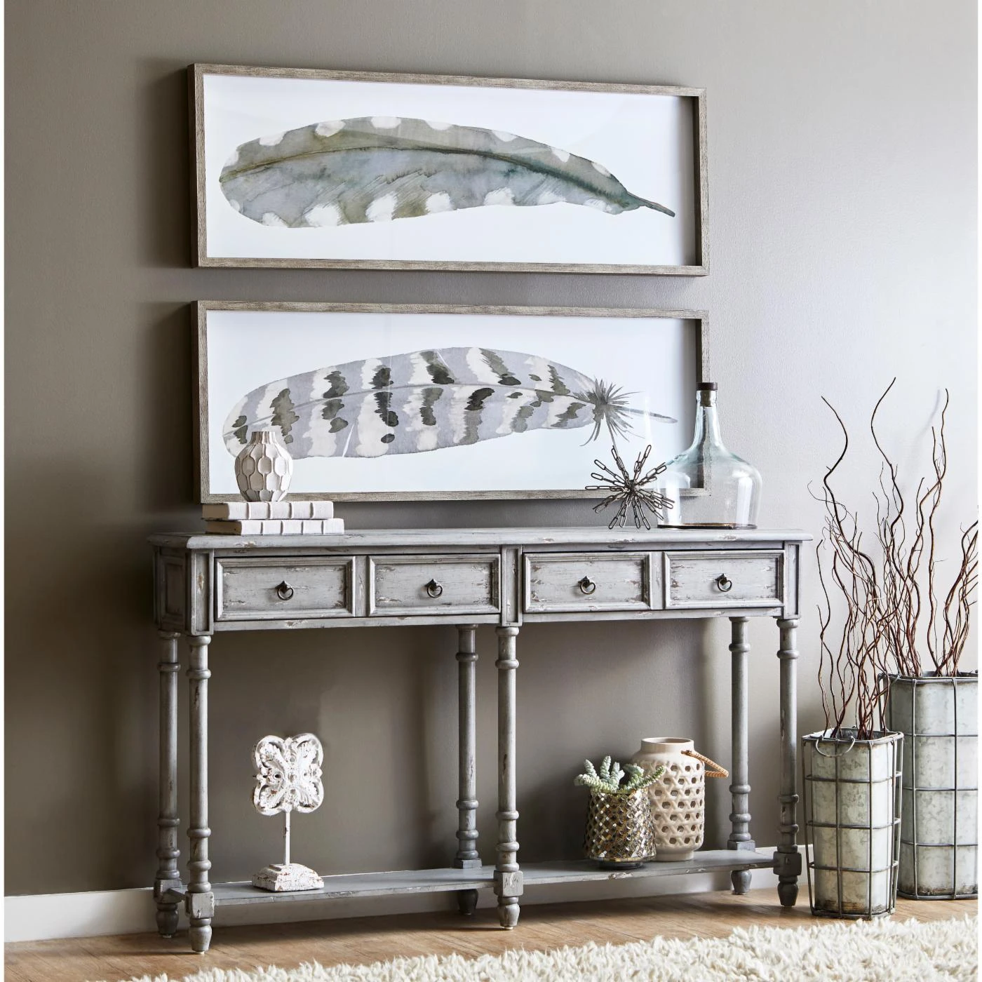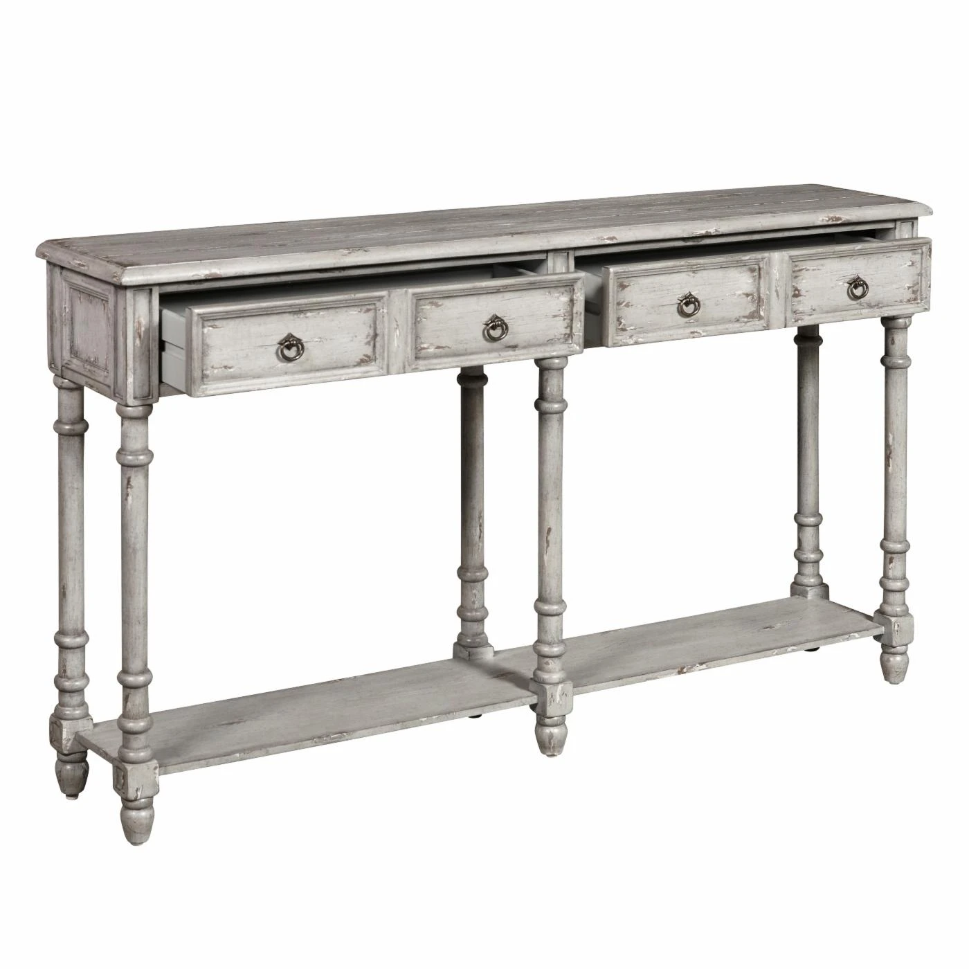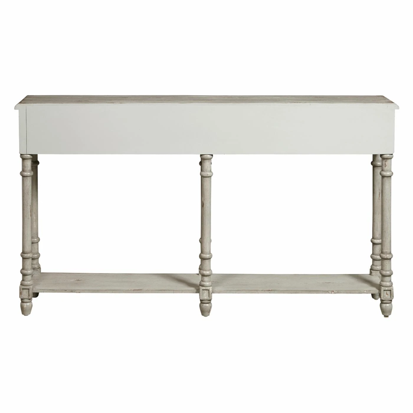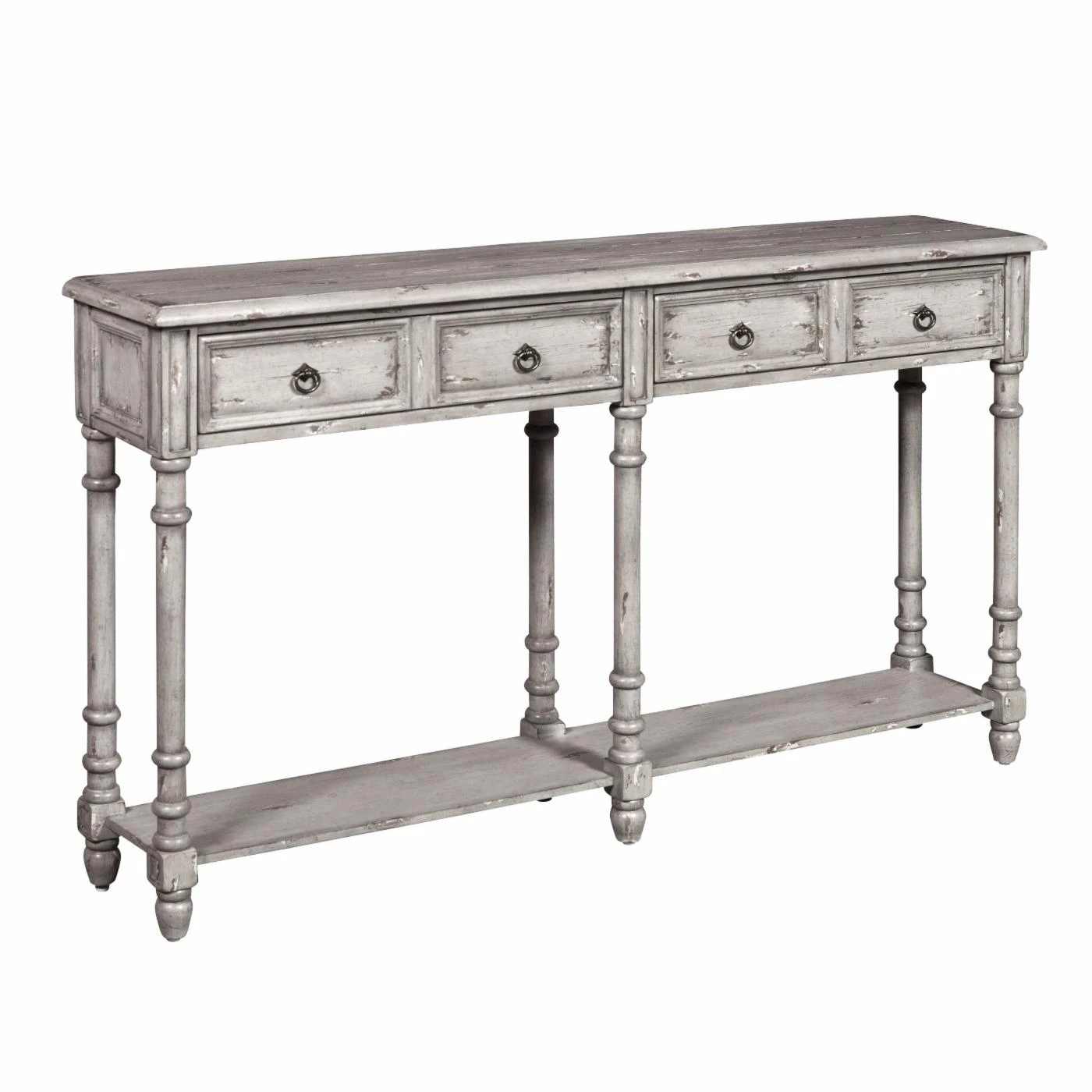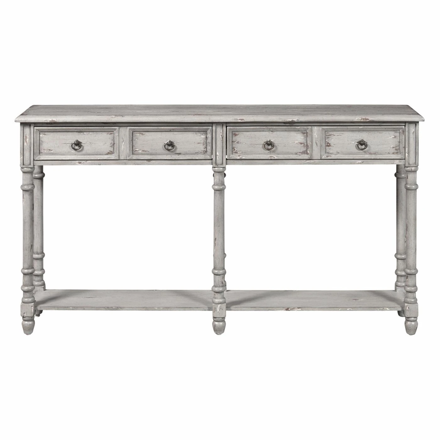 The HomeFare Distressed 2 Drawer Console Table is full of thoughtful details that make it easily mistaken for a real vintage find. Long and slender legs have turned knobs which draw the eye and each drawer has two antiqued brass ring pulls. And, of course, the table is finished in a soft gray which has been heavily distressed by hand to reveal the wood undertones beneath. Use the console top or the lower fixed shelf to display your favorite decorative accents.