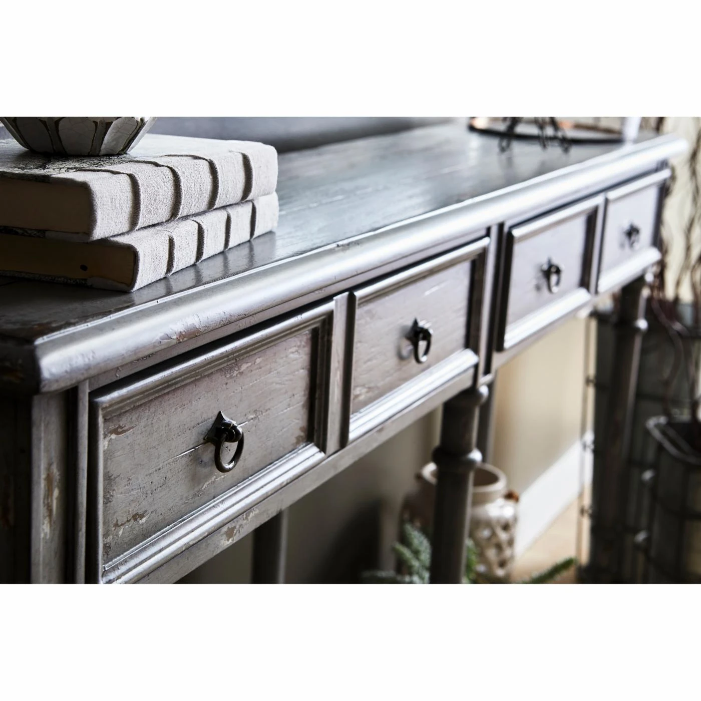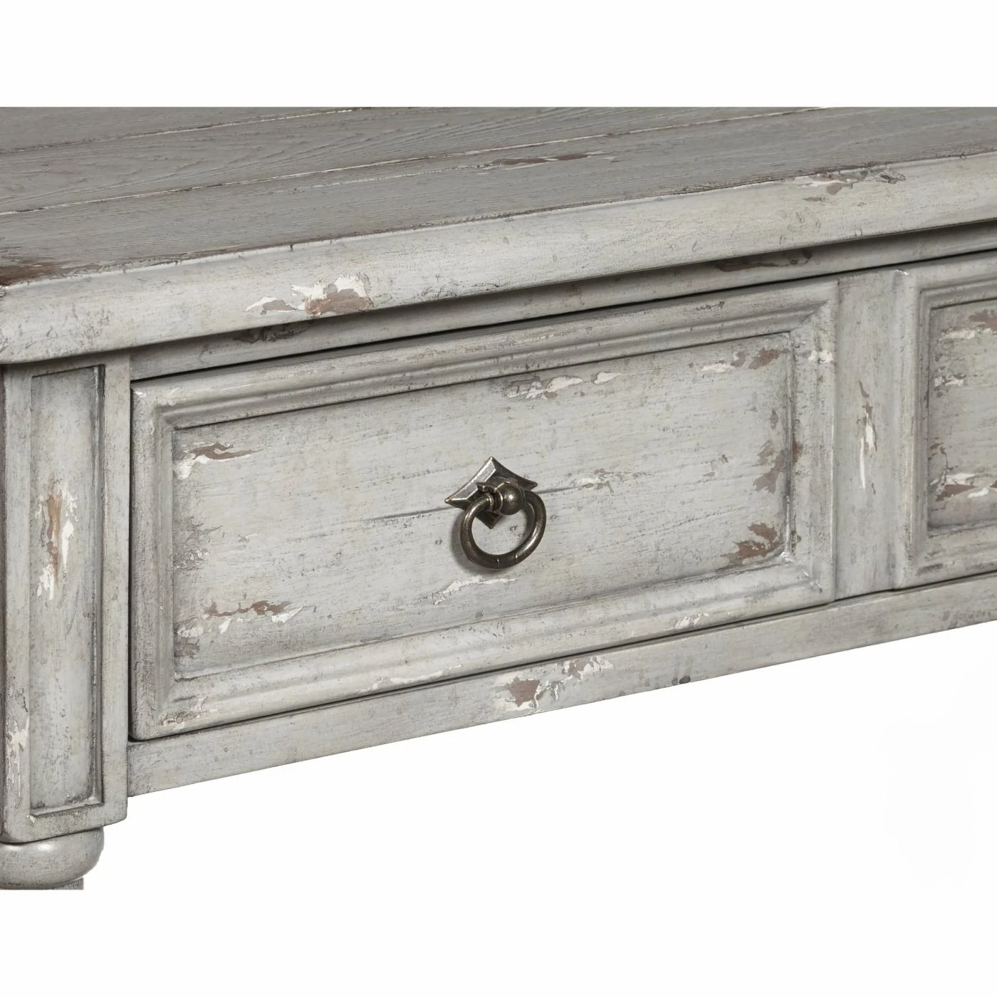 - Heavily hand-distressed gray hue with natural wood undertones