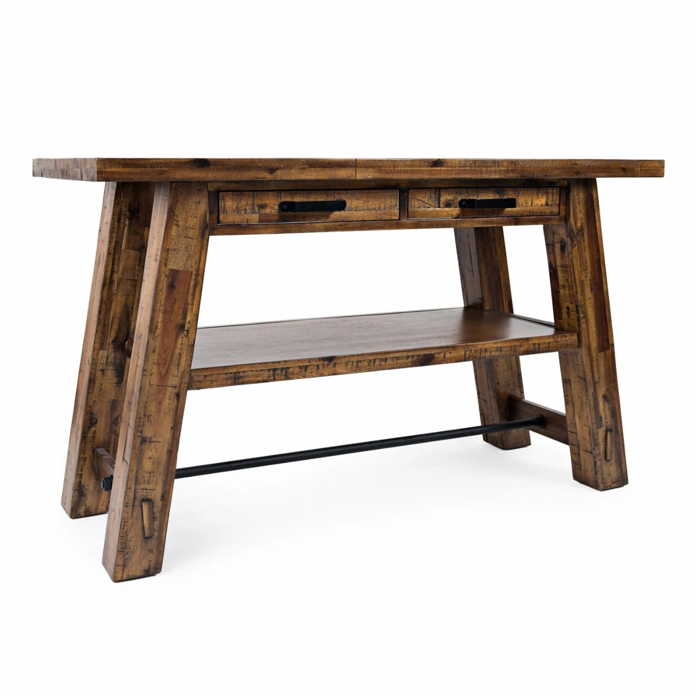 Craftsman details of the Jofran Cannon Valley Trestle Sofa Table includes a thick, flared trestle base and mortise and tenon joinery. Industrial touches come from physical distressing and a black metal rod stretcher with overscaled bolts. This sofa table features two slim drawers and a generous open display shelf.