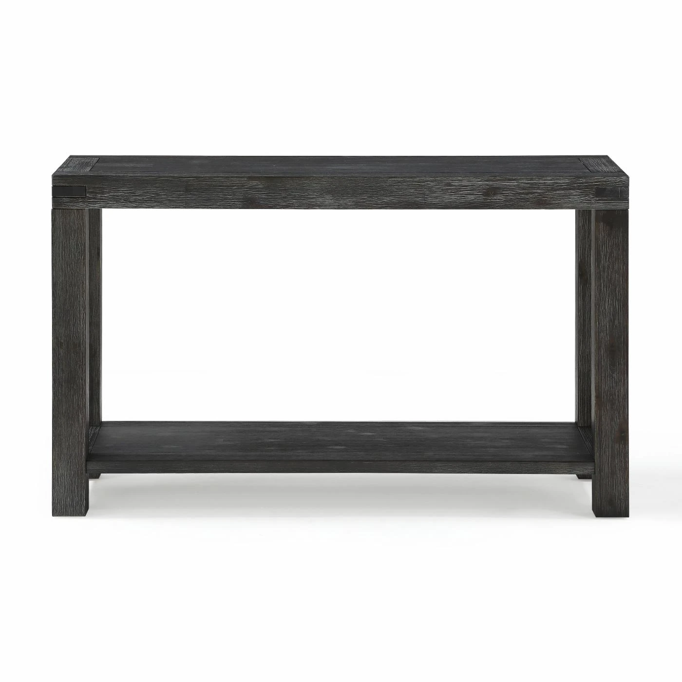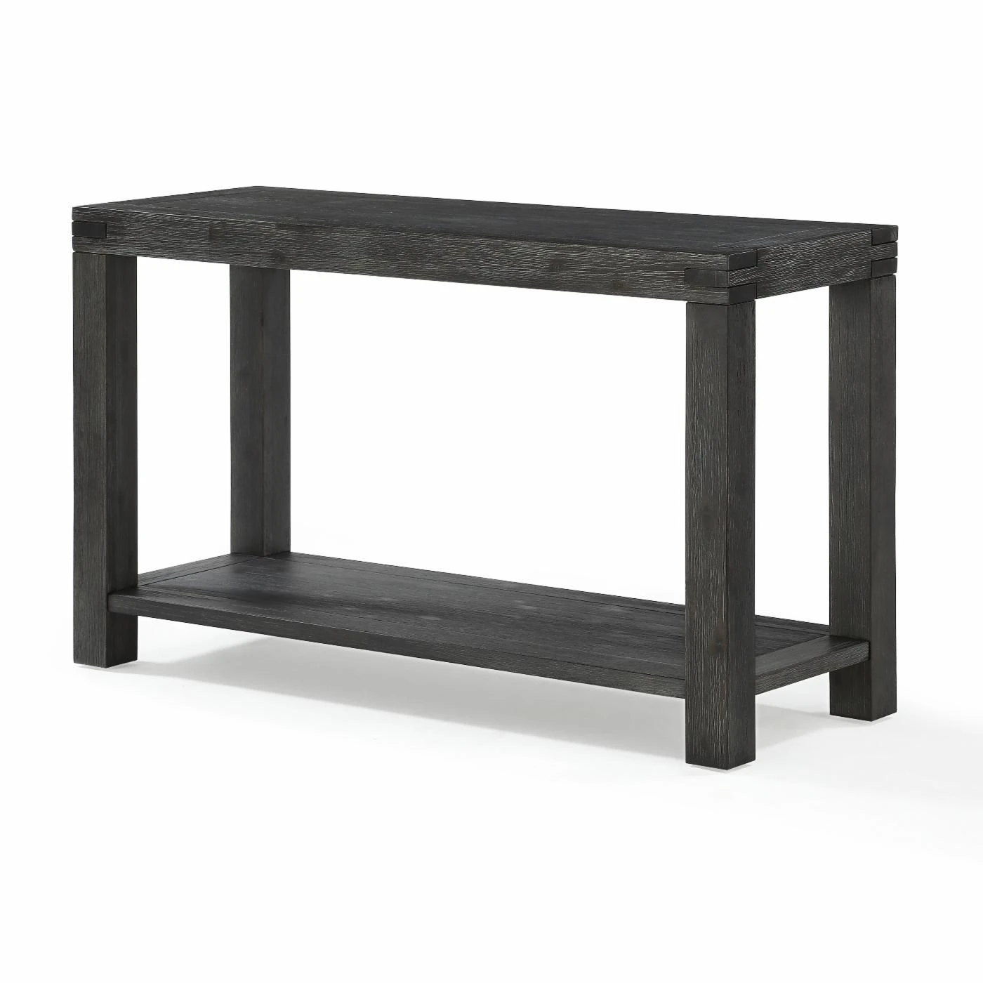 Meld your own rustic contemporary style with the Modus Meadow Console Table. This console table features a contemporary look with the lower shelf and block shaping. The rustic look is accented by the reclaimed and distressed graphite finish.