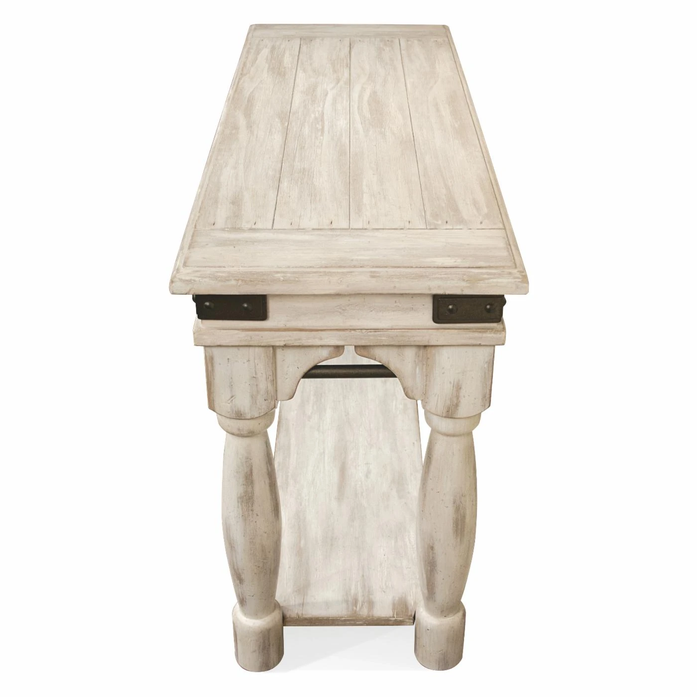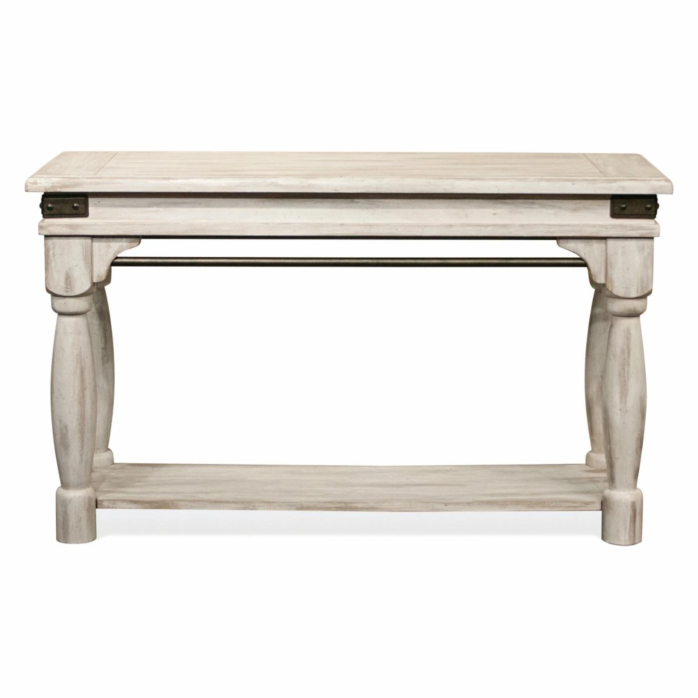 Provide your living room with the perfect finishing touch with the Riverside Furniture Regan Sofa Table. This charming sofa table looks great with modern and classical furniture alike. Its rectangular frame is built from thick hardwood with an expansive lower shelf and shapely legs. A metal stretchers and metal corner caps lend some visual dynamism to the look, finished in gray. The frame is topped by select veneers and then finished in a distressed white color.