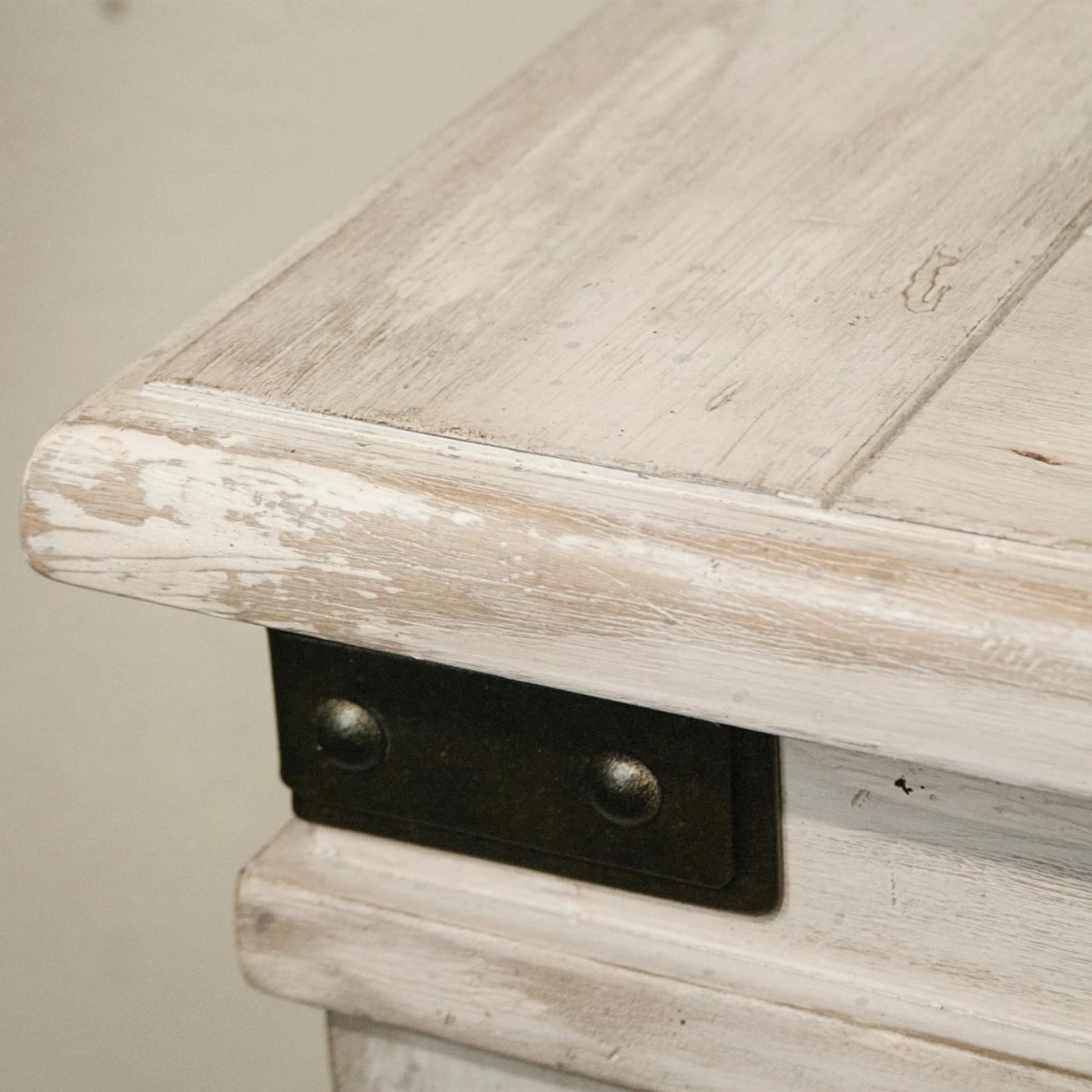 - Distressed white finish over veneers