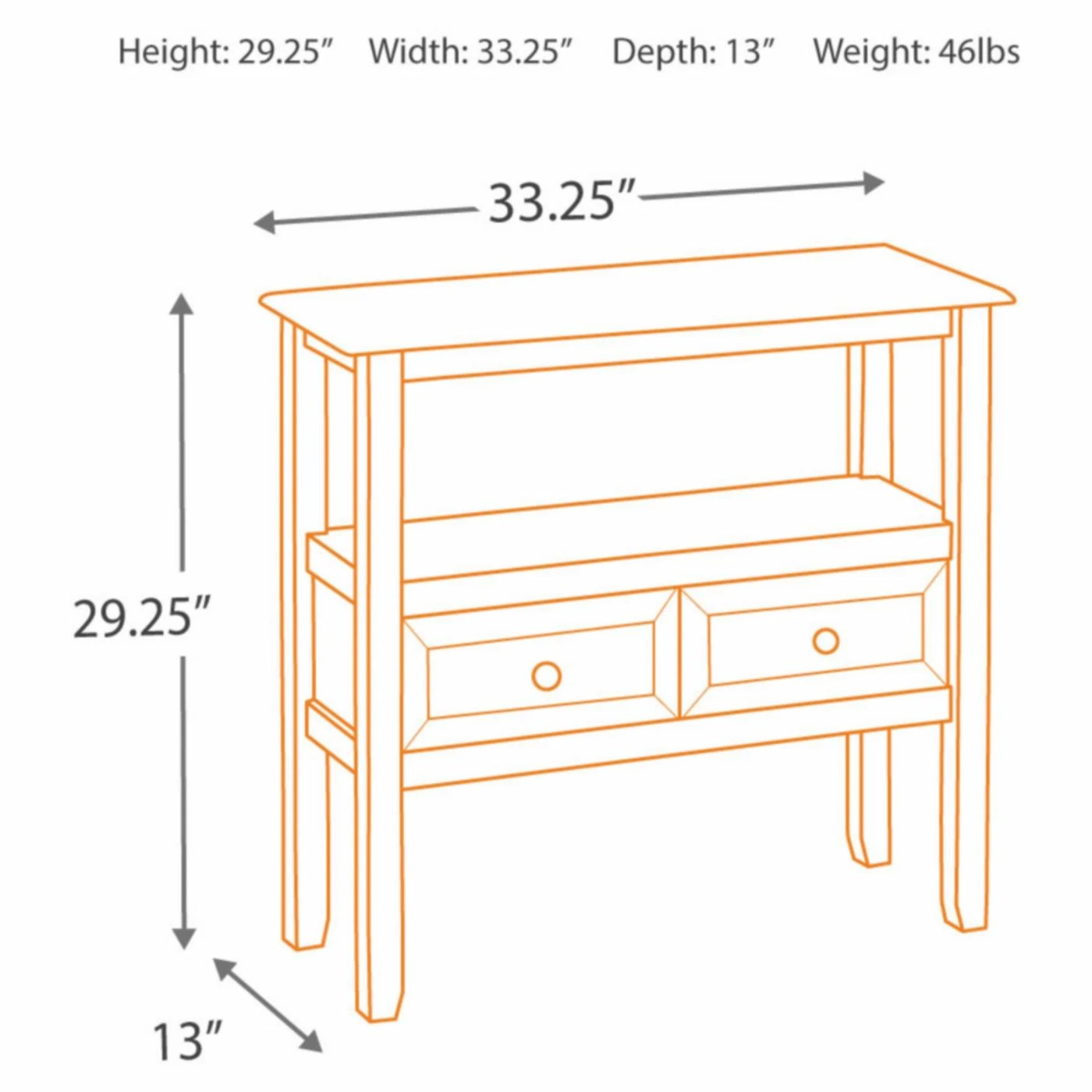 A beveled tabletop and two raised-panel drawer fronts give the Signature Design by Ashley Abbonto 2 Drawer Accent Console Table an elegant, timeless look. To bring out the natural grain of the solid acacia hardwood, the table bears a warm brown finish. You can store books, baskets, or bins on the open shelf or use the area to display decorative items.