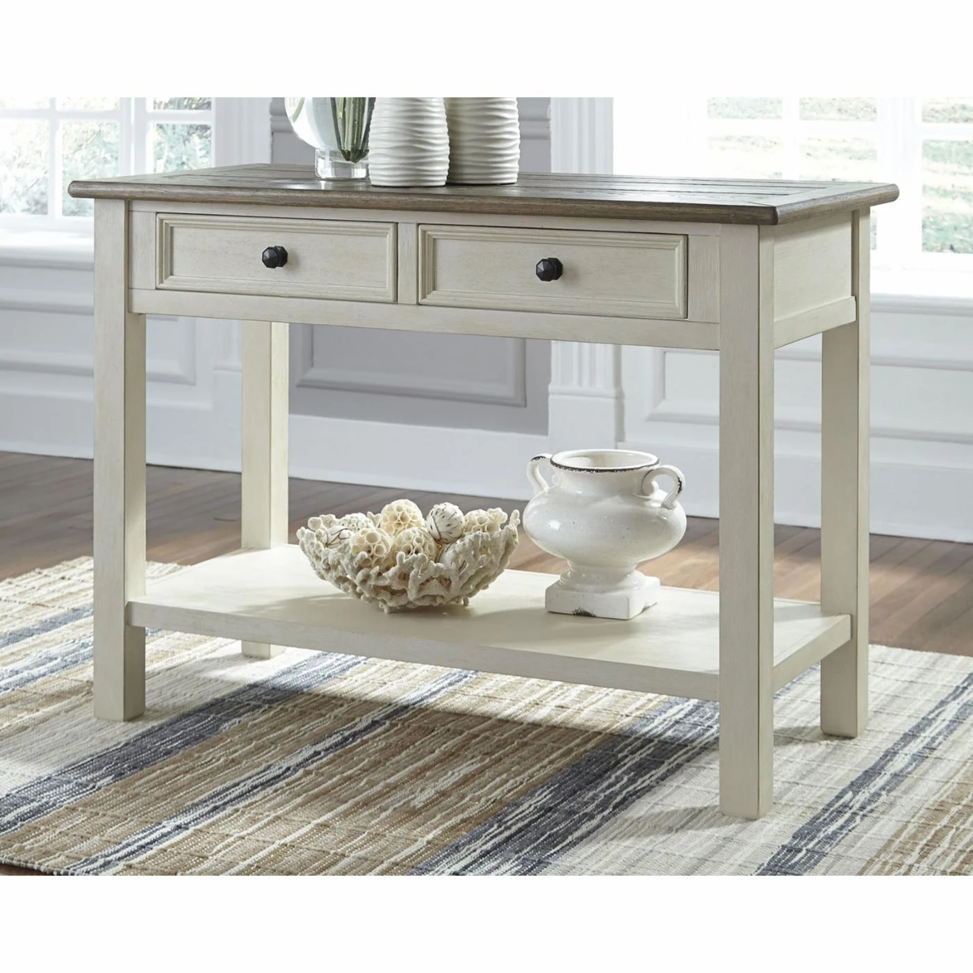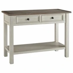 Bearing a distressed white and natural brown finish on white oak veneers, the Signature Design by Ashley Bolanburg Rectangular 2 Drawer Sofa Table brings a touch of country charm to seating areas. The solid and engineered wood sofa table features side-by-side double drawers for managing clutter. Below, an open shelf gives you storage space for reading materials, board games, baskets, or decorative accents.
