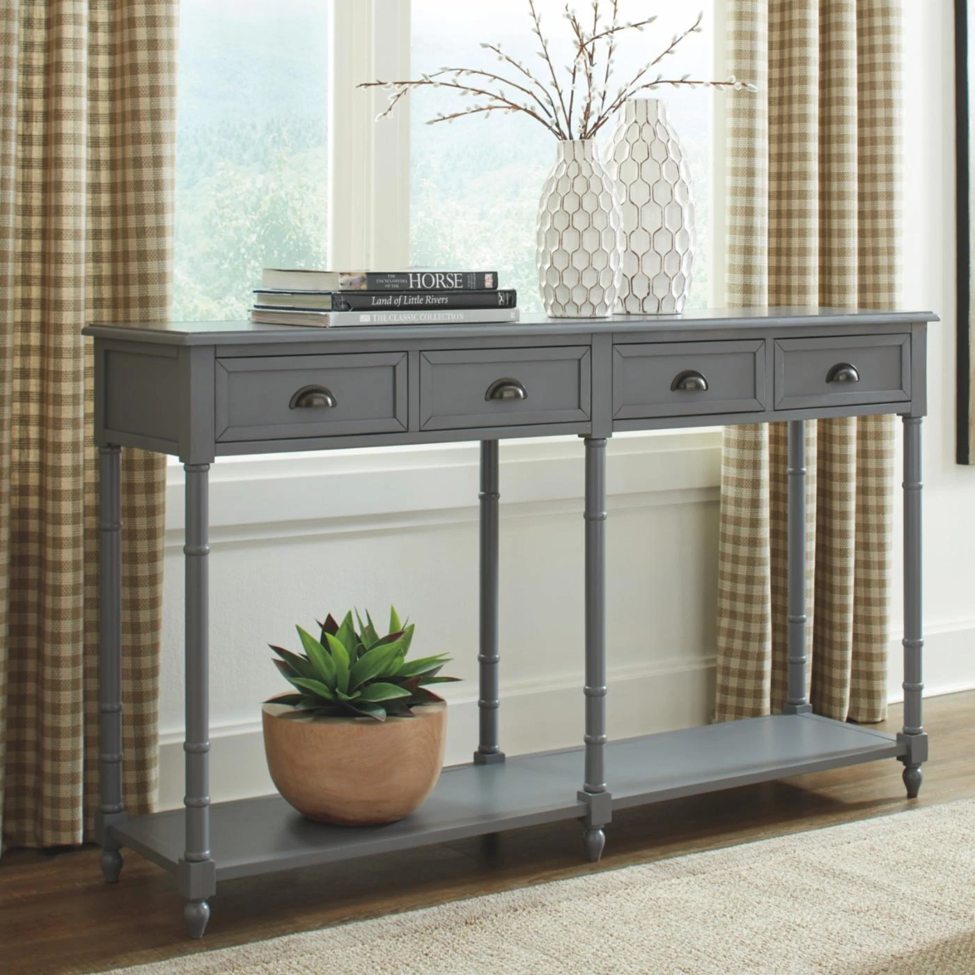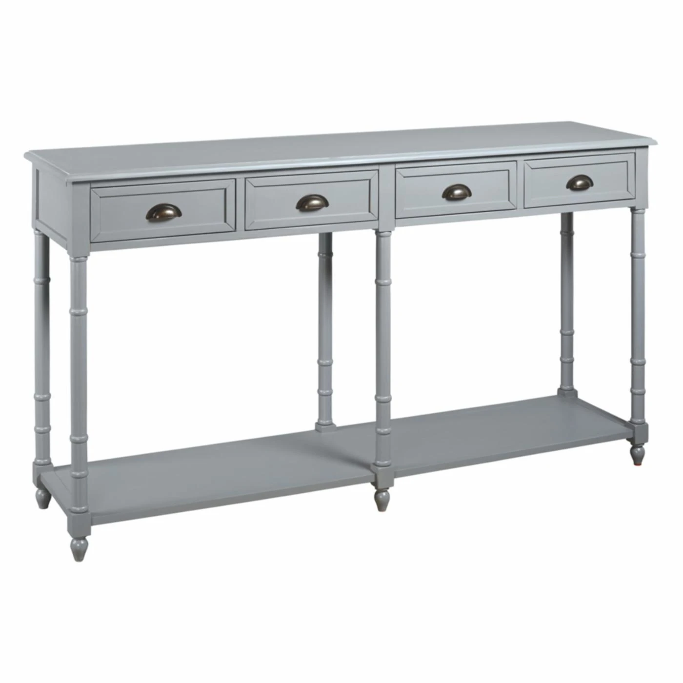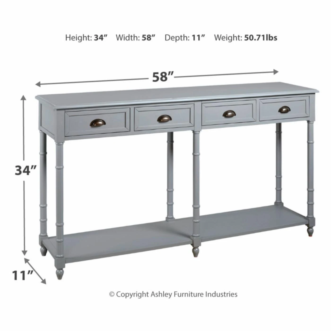 Storage and style are best friends when it comes to the Signature Design by Ashley Eirdale Console Table, making it your dream come true. From its turned legs to its framed drawer fronts, this console table is a study in classic elegance. Its veneers, solid, and engineered wood construction is topped in the available finish of your choosing for the perfect complement to your home. Four smooth-gliding drawers and one lower shelf give you excellent storage and display potential. Cupped metal drawer pulls in an antique bronze equip the drawers and lend a final chic flourish.