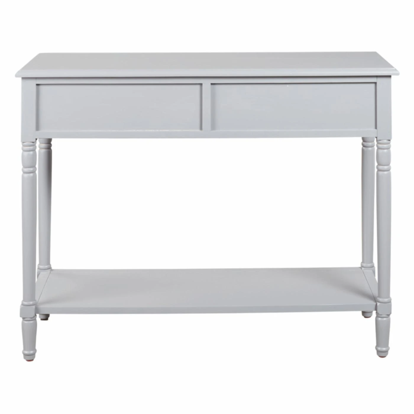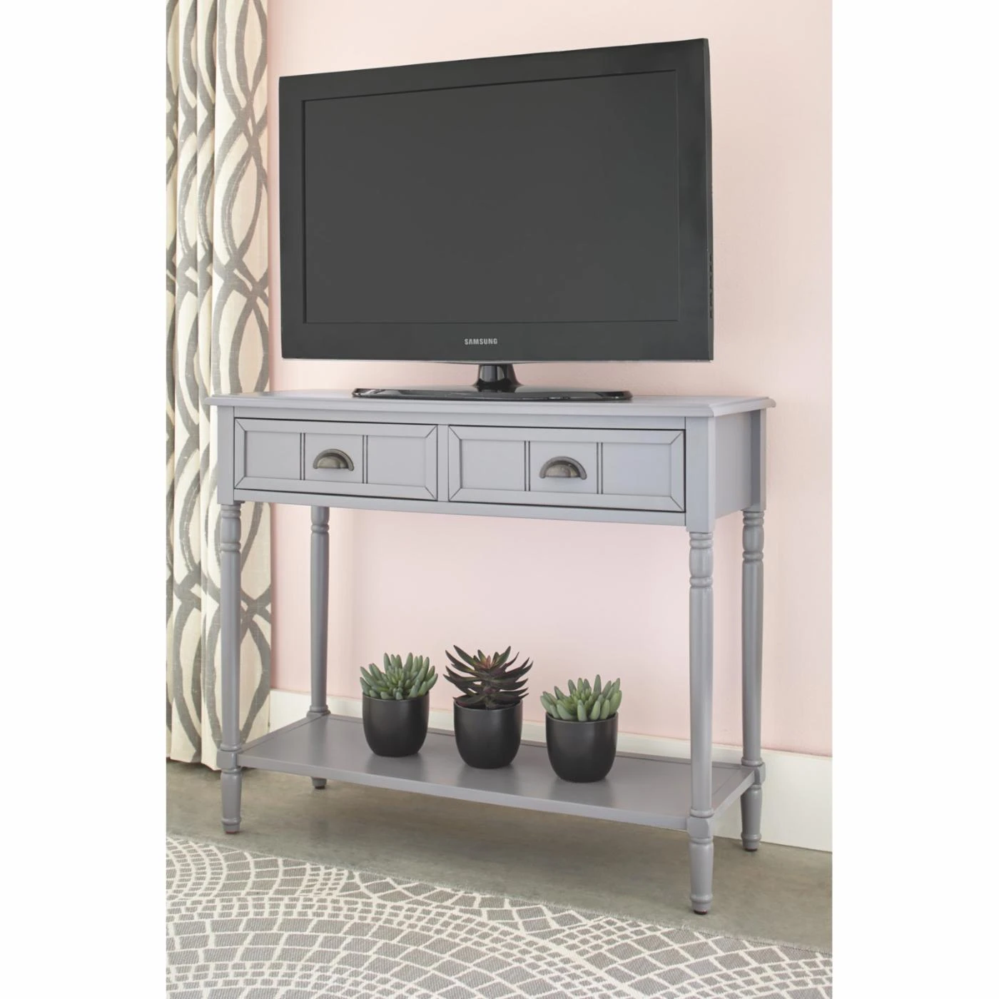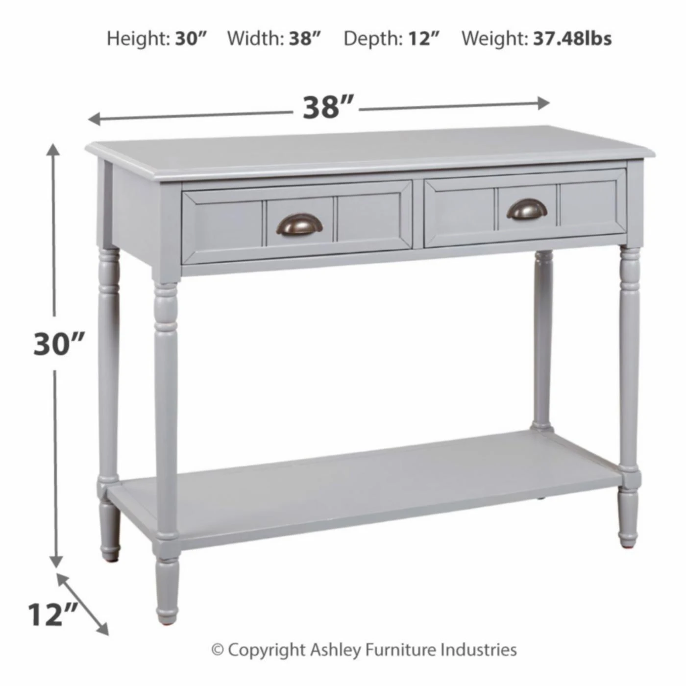 Classic elements are combined with crisp lines to produce the Signature Design by Ashley Goverton Console Table, a becoming piece with endless potential. This console table’s turned legs, framed drawer fronts, and antique bronze drawer pulls give a nod to the past while its clean angles and finishes are rooted in the present. Its two smooth-gliding drawers can store whatever you please while its spacious top can be home to your favorite decorative pieces. Select from the available finishes.