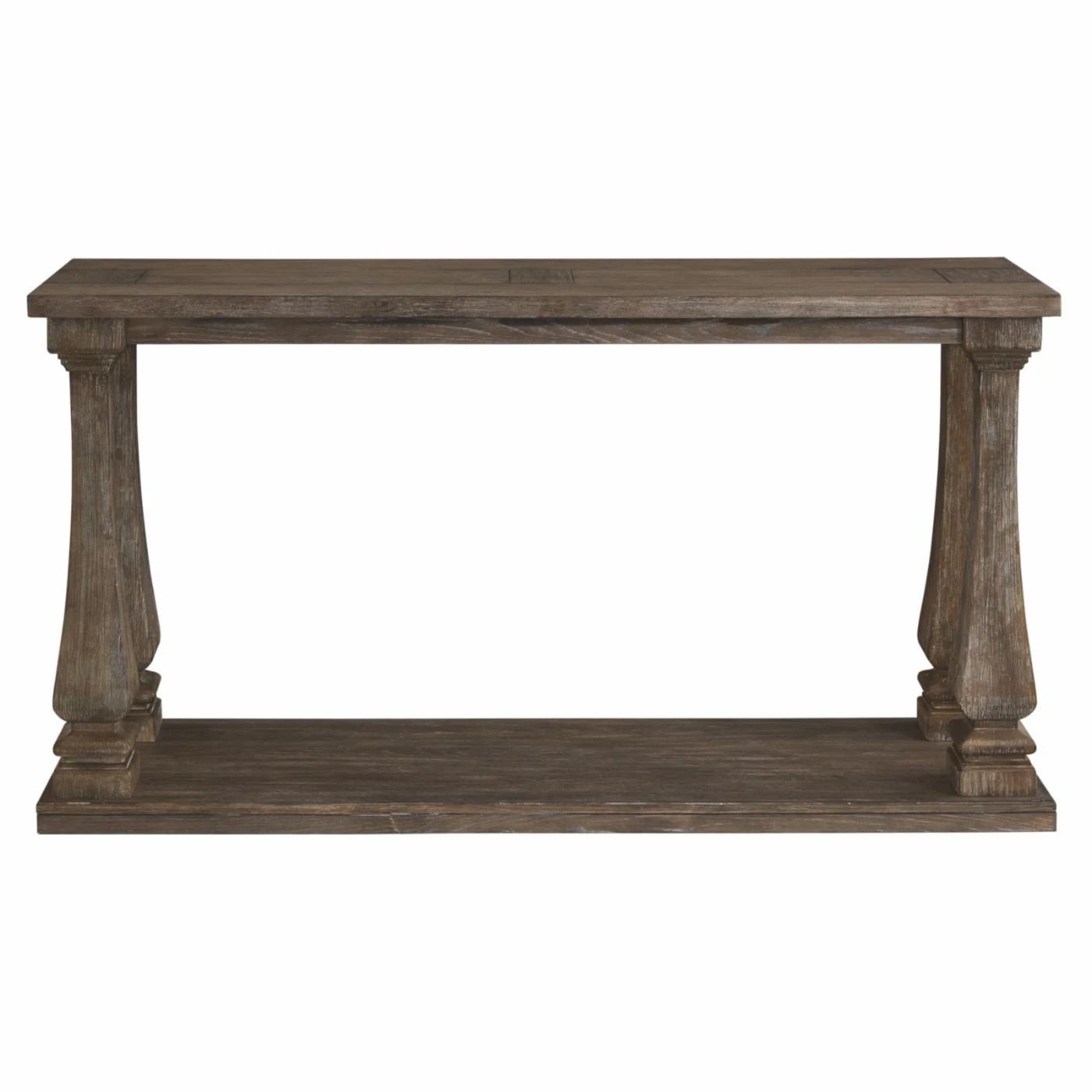 Display the Signature Design by Ashley Johnelle Sofa Table behind a sofa or in the entry of your traditional home. This sofa table features a durable construction with a lightly distressed gray finish for a loved-over-time appearance. The elegant style of the wood feet draws the eye to the lower display shelf of this sofa table.