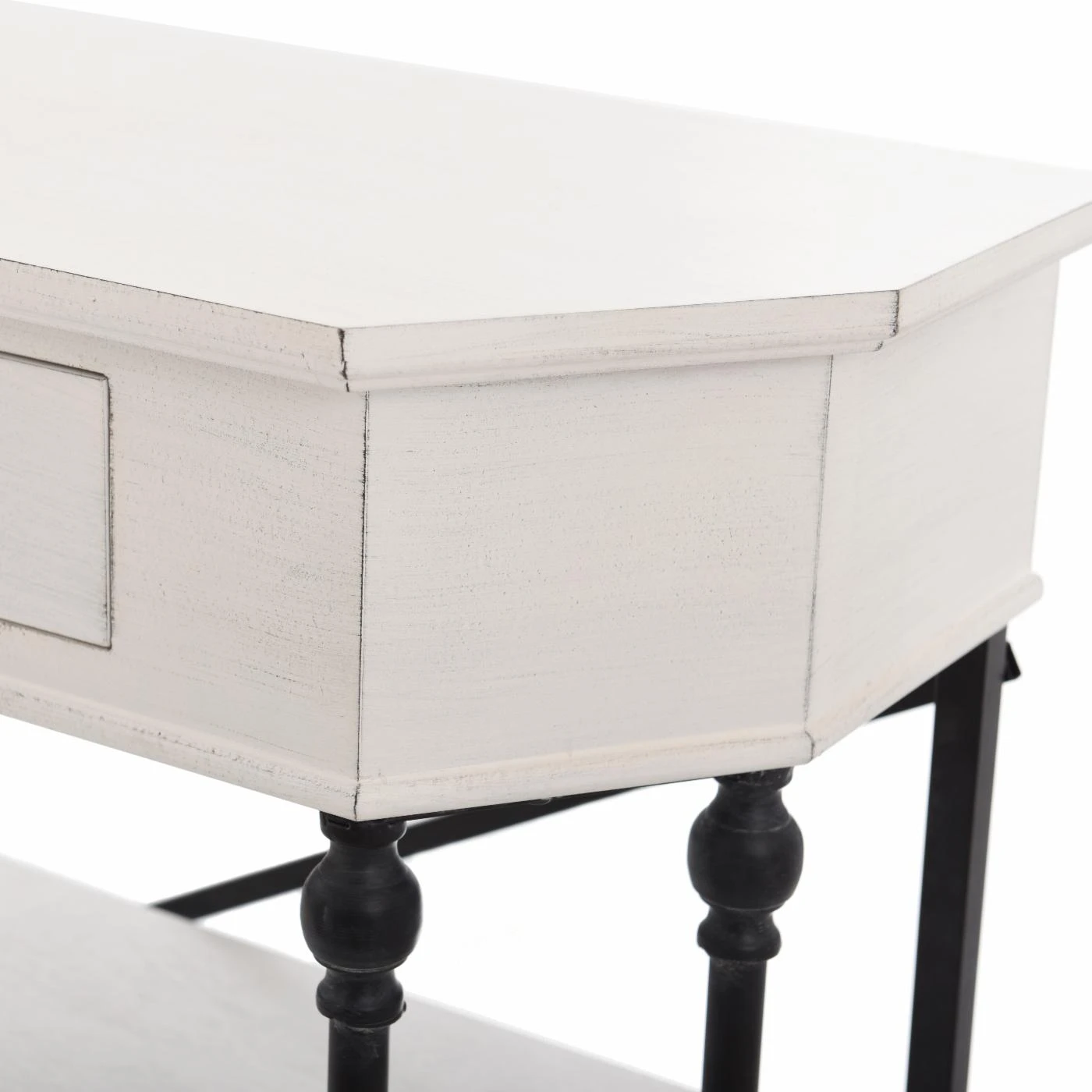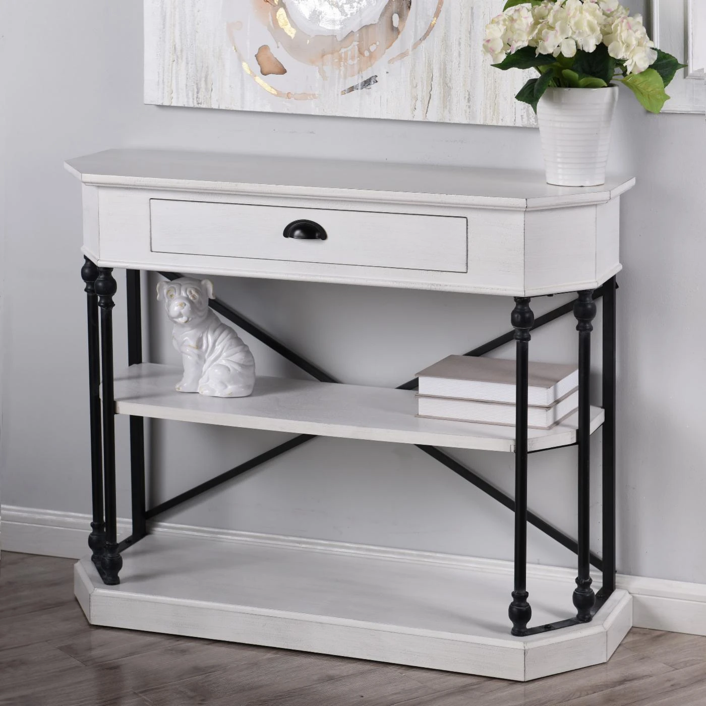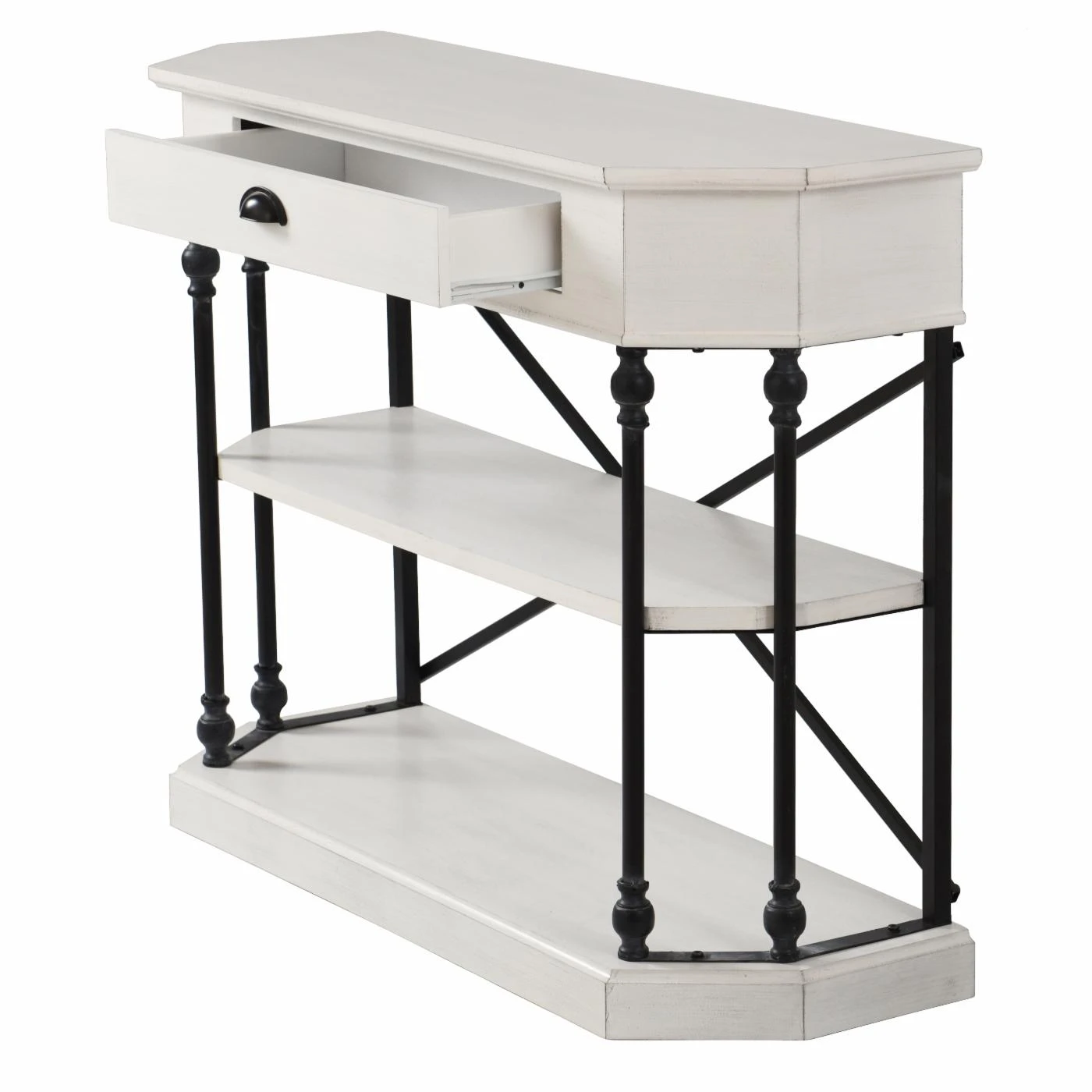 A compact design abundant in storage and display, the StyleCraft 3 Tier Single Drawer Clipped Corner Console Table is perfect for your entryway. This console table is constructed of wood in an antique white finish. Each shelf is supported by a metal frame. An X-style support at the back and turned supports on the sides are finished in black for contrast. Two open shelves add display, and one drawer offers enclosed storage. Clipped corners give this console table a unique shape and a smaller footprint.