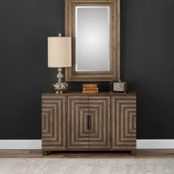 Modern with two-toned detailing, the Uttermost Layton Geometric Console Cabinet has a mid-century vibe with clean lines and a smooth, flat front. This console cabinet is crafted of fir, engineered wood, and iron, for a sturdy look and feel. Outfitted with two fixed interior shelves for linens, craft supplies, and personal items, this cabinet ensures your space stays clutter-free.